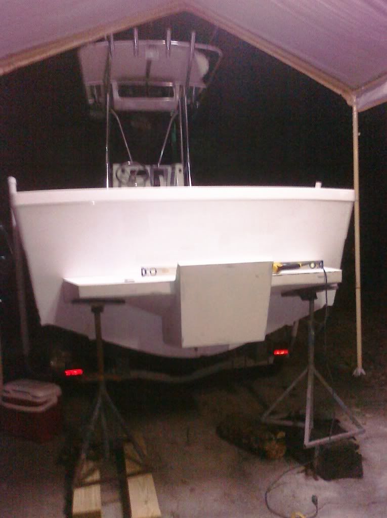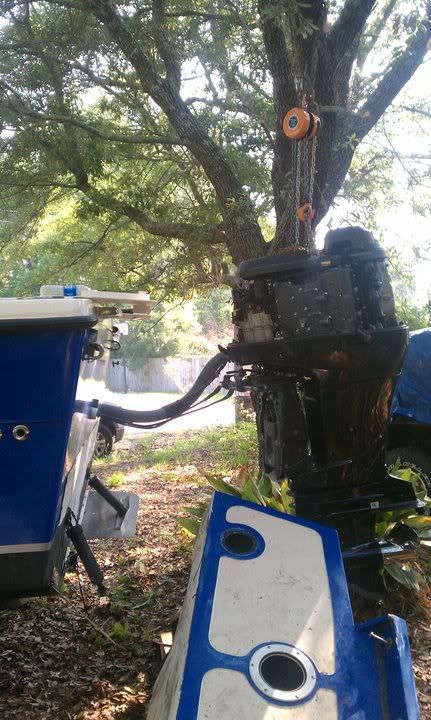 NSS8… Now I need your your bottom reading skills. Finally got to the computer to get some pics up. The first outboard bracket was made of fiberglass and cracked on me. Replaced it with a stainless marine bracket. I had to revert to our old Mchenry Ave. Oak tree engineering to get it free.