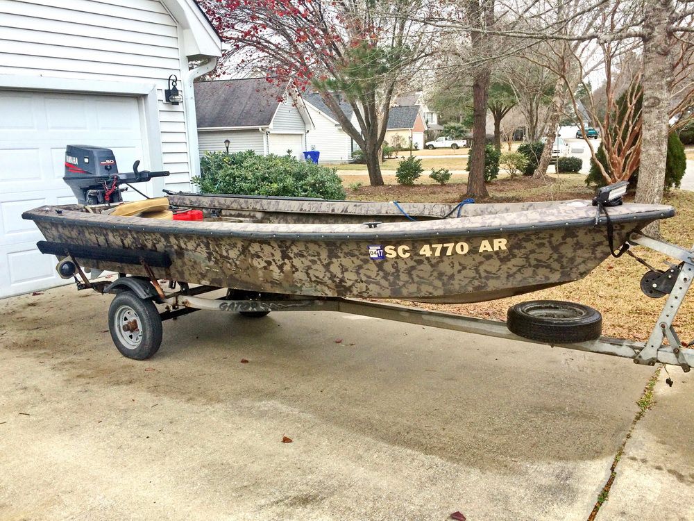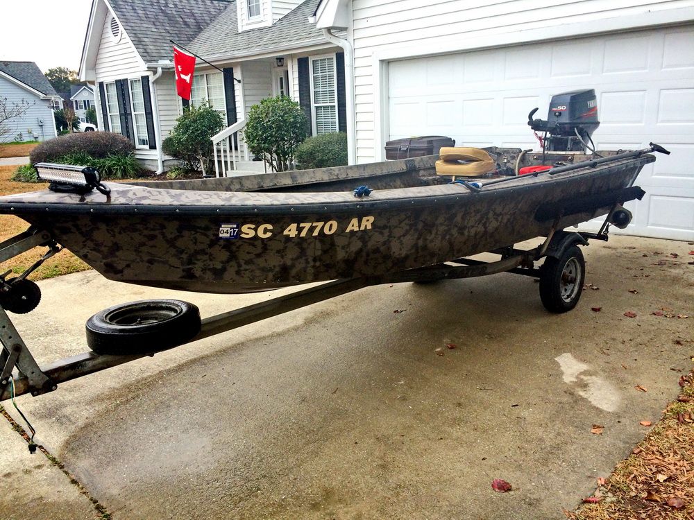 This is a ‘96 model 1503 Super V. Boat is the open floor plan with no front bench. Charleston bench in the back. 20" transom, Nat Gear paint. Includes 2 seats, aluminum break plate, Yamaha 6 gal tank and a 12 gal tank (pictured), 20’ LED light bar, interior LED lighting hidden under gunwale. Nav/running lights, interior LED lights, light bar, and bilge pump are hard wired/switched. Also has one of those battery boxes with the test light and trickle charger posts.