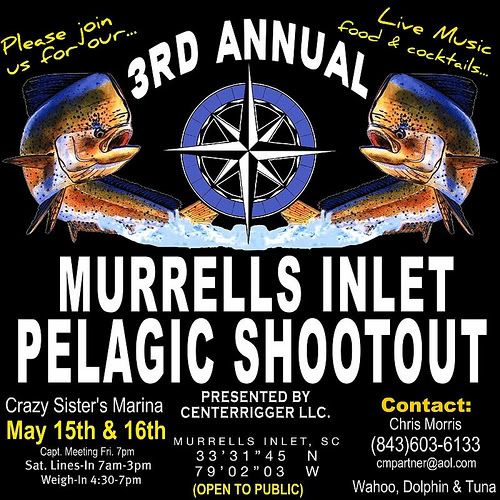 The Murrells Inlet Pelagic Shootout is right around the corner. The tournament will be held May 15 and 16. The Captains meeting will be on Friday and fishing is scheduled for Saturday. Once again we will be targeting Tuna, Dolphin, and Wahoo. The combined weight of your largest of each species will determine the winner of the tournament. We will also have 4 optional categories that will be based on the heaviest tuna, heaviest dolphin, heaviest wahoo, and overall heaviest fish caught in the tournament.
