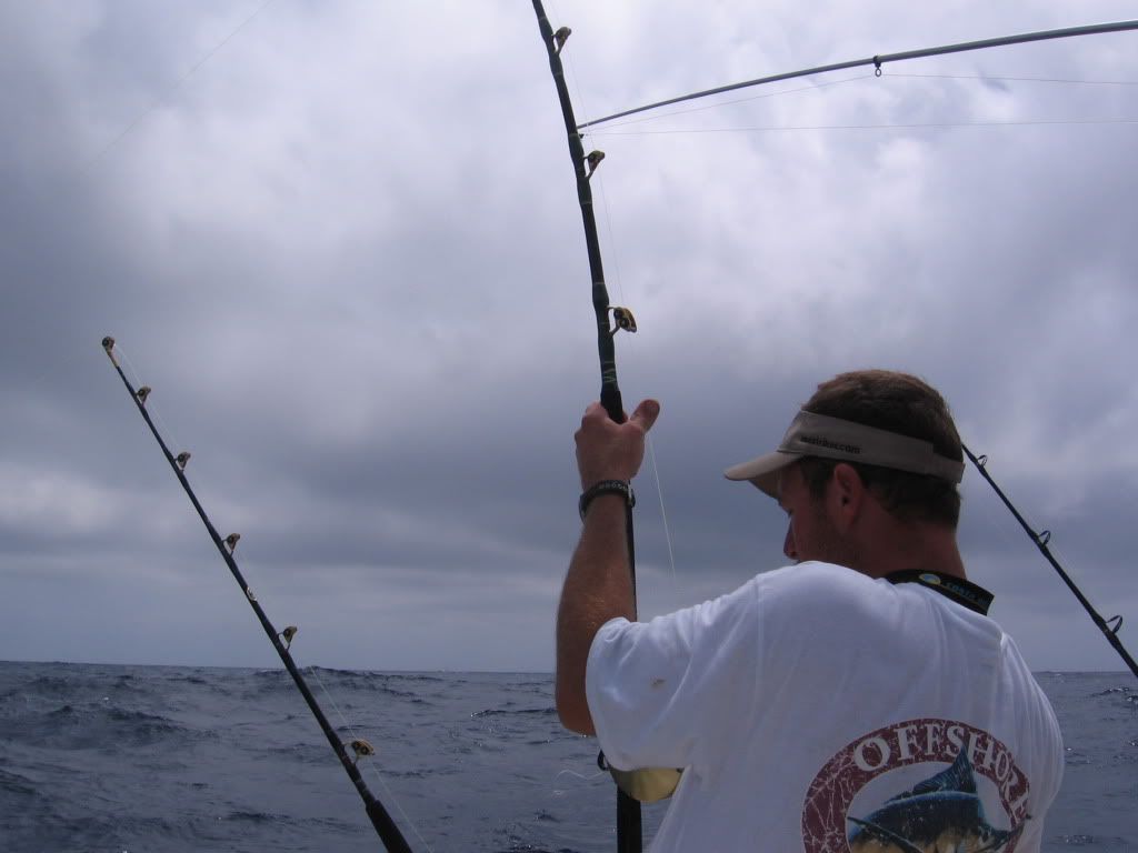 Came through the rocks at 5:15 for a 3 hour ride out. Started out about 5 miles north of the hole and found 75 degree water about 1 mile from the hole. Non stop action till about 1:00. Ended the day with 11 blackfin, 3 dolphin, and 25 sea bass. Rough ride out, but the seas laid down for the ride home.