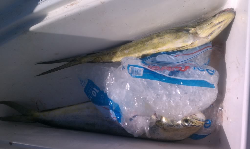 After some sightseeing along the way we got about 5 miles from the ledge at 11 deployed the lines and got going. Made it about three miles to about 145’ and had three hits in a about 10 seconds. We were able to pull in two dolphin and lost the third. Trolled for about 2 more hours, didn’t see any weed lines, and headed in. Hit the channel for a little bit hoping for some kings but will definitely have to wait for later in the season to find them there.