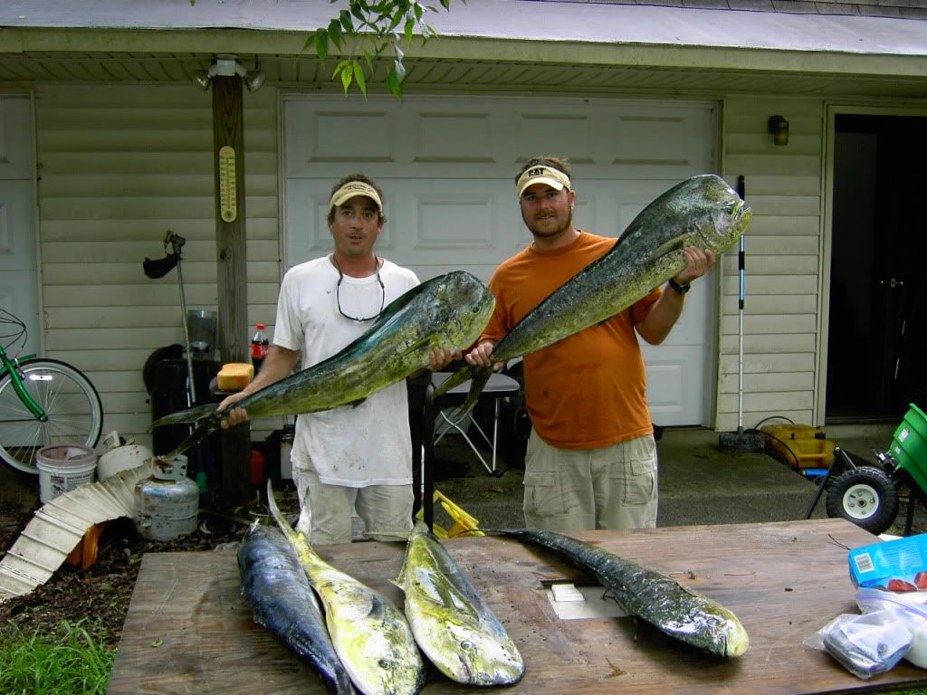 Lines in at 6:45 in 130’ around some scattered weeds. Downrigger line goes off about 10 min. later with a cuda. Next bites came in 180’ when we hit a school of dolphin and put a slinger and a nice bull in the box. Circle back on em and put another nice cow in the box. Fished around for a while then came back through the same area and caught another nice cow. Slow for a while after that so we trolled back in and hooked one in about 150’ that pulled off. Then back in to about 135-140’ where we hit a little hot spot and brought a nice fish to the boat with one trailing it so we got to catch one on the spinning rod. Circle back around and caught a nice bull and a wahoo. Pulled lines in at 2:00 and had a bird chain with a lure on the back in my hand when a cuda grabs the lure. Hand lined in a 5 lb. cuda to finish the day.