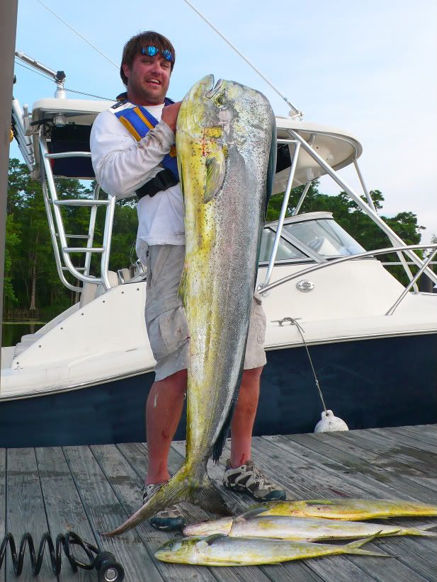 First trip of the year for us. Put lines in se of santee banks after a snotty ride out and had the daymaker bull in about 15 minutes. Didn’t get a weight on it but it was well over 60lbs. Taquache is 6’3" and the fork of the tail was just under his chin and the filets were 5 1/2’ long. Ended the day with 5 dolphin, and 4 missed fish. All fish bit the Lehi weighted heads.