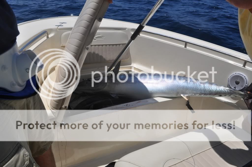 Headed out 5/15 at 4:30 am from the Cut to get our a@# handed to us.At 150’ decided to drop lines and head toward 226. Very slow morning with one small cuda. At noon decided to start trolling toward home and that is when it started for about the next two hours in 220’ of water. First a small dolphin, then the wire line with a 20 lb wahoo. We then managed a couple more nice dolphin before the day maker hit. The way back went off screaming, so we cleared all lines and the fight was on. Two Coors Lights and two buds for my “First Mate” later we had the fish to the boat. Then with one gaff to the head and one to the tail we got the big wahoo in the boat. Next problem he would not fit in the fish box. So we shoved as much of him in the box as possible and made Santo sit on the lid till the fish died and we could get him in the fish bag, second problem. He was about 12" too long for the fish bag, but we managed. Finished the day with a double hook up of dolphin.