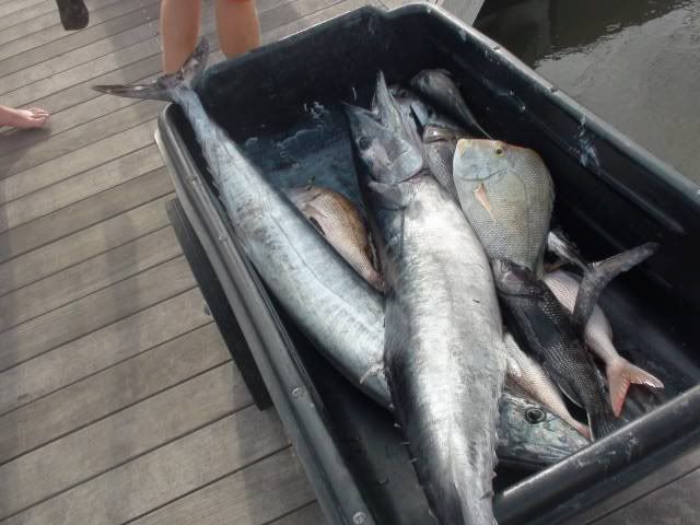 Trolled south early enjoying 2 for 2 on hoos and a 15 lb little tunny. then headed for the bottom drops for an assortum of pogies, snapper and back sea. heaviest hoo 55lb. all trolling action on ledge