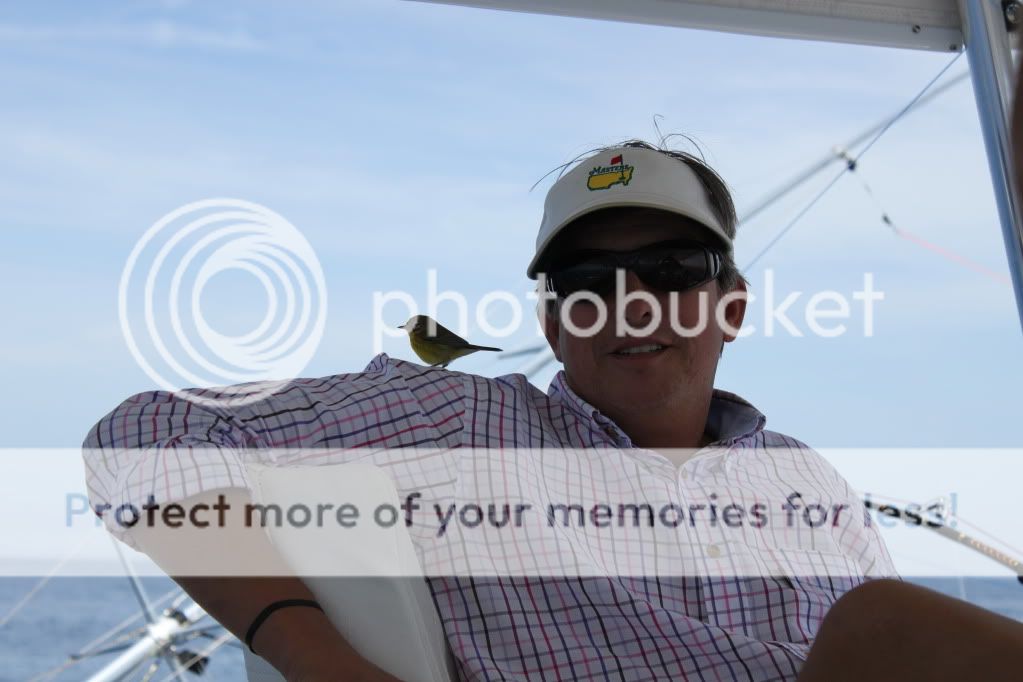 Think I have had the same bird on my boat! He went down into the cabin and ate all the flys,then flew back to fly bridge, stayed on my sholder till he saw a freighter close by and hightailed it. Had one years ago land on a sleeping mate on v berth, He sat up so quickly he knocked himself out on a reel hanging from a rod holder on the ceiling