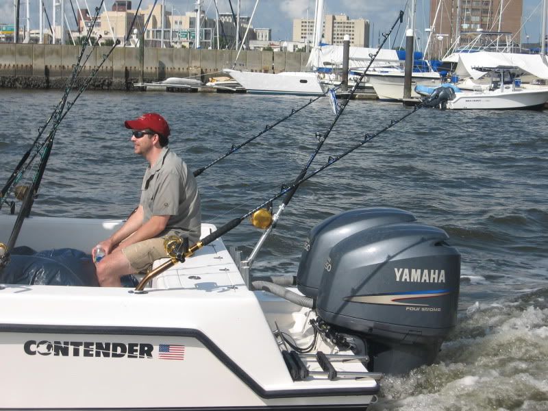 ) and tried to help with the fish. He is not in the prop but around the starboard motor. I grabbed the leader in pulled him in a bit, Chunky stuck him but the hook and line in his mouth were stuck in trim of the motor so he could not get the fish out into the boat. Fish begins to go wild, fish flops off gaff, line breaks. Game over!![]()