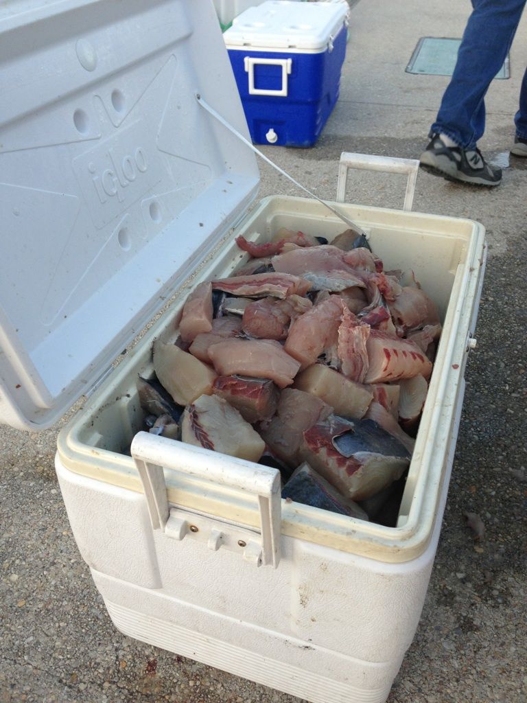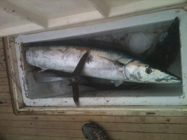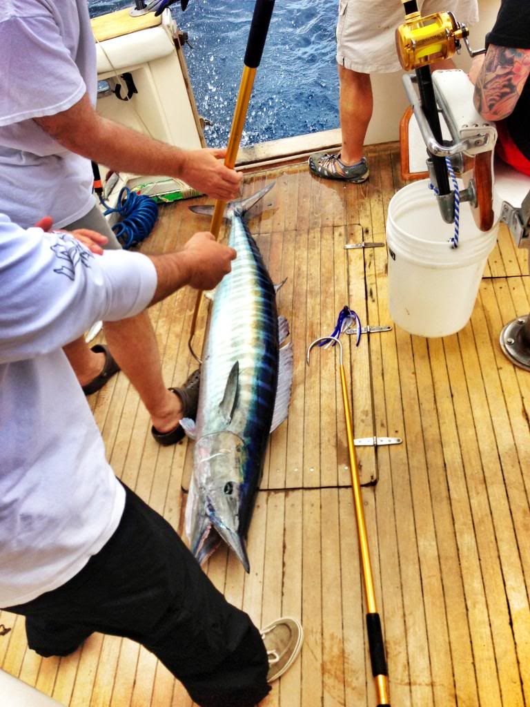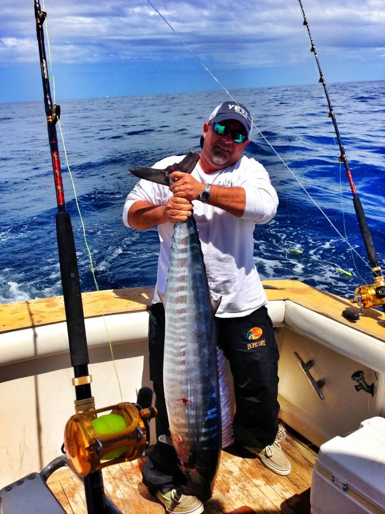 Charlie and Robert put us on some monster wahoo yesterday at the hole. Total of 4 (all above 50lbs). the biggest one was pushing 75/80, NONE of them would fit in the Oceans fish boxes!!! We had to cut the tails off to keep the ice on them. We also hooked up with a football BFT and some Bonitia’s.