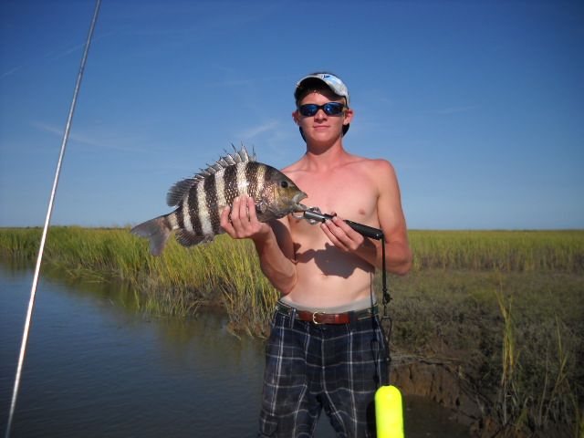 Went out last Saturday to shrimp Bulls Bay for the first time. It was a weekend of firsts, actually. I had never been shrimpbaiting and I had never been to Bulls Bay either. We put in a Buck Hall and eased out into the bay about 8:30 last Saturday to be met with the Spanish Armada. There were boats shrimping everywhere! So we putted along, making sure not to go through any poles and finally found an open spot and got set up. We used baitbinder and put 2 baits out per pole. 6 passes later we had about a half of a cooler. The net thrower was tired and wanted to fish, so we puled poles and went fishing. While fishing a new creek, he got bored fishing and decided to throw the net a few more times. Second cast he netted a sheepie for dinner. Went 5 lbs on the Boga.