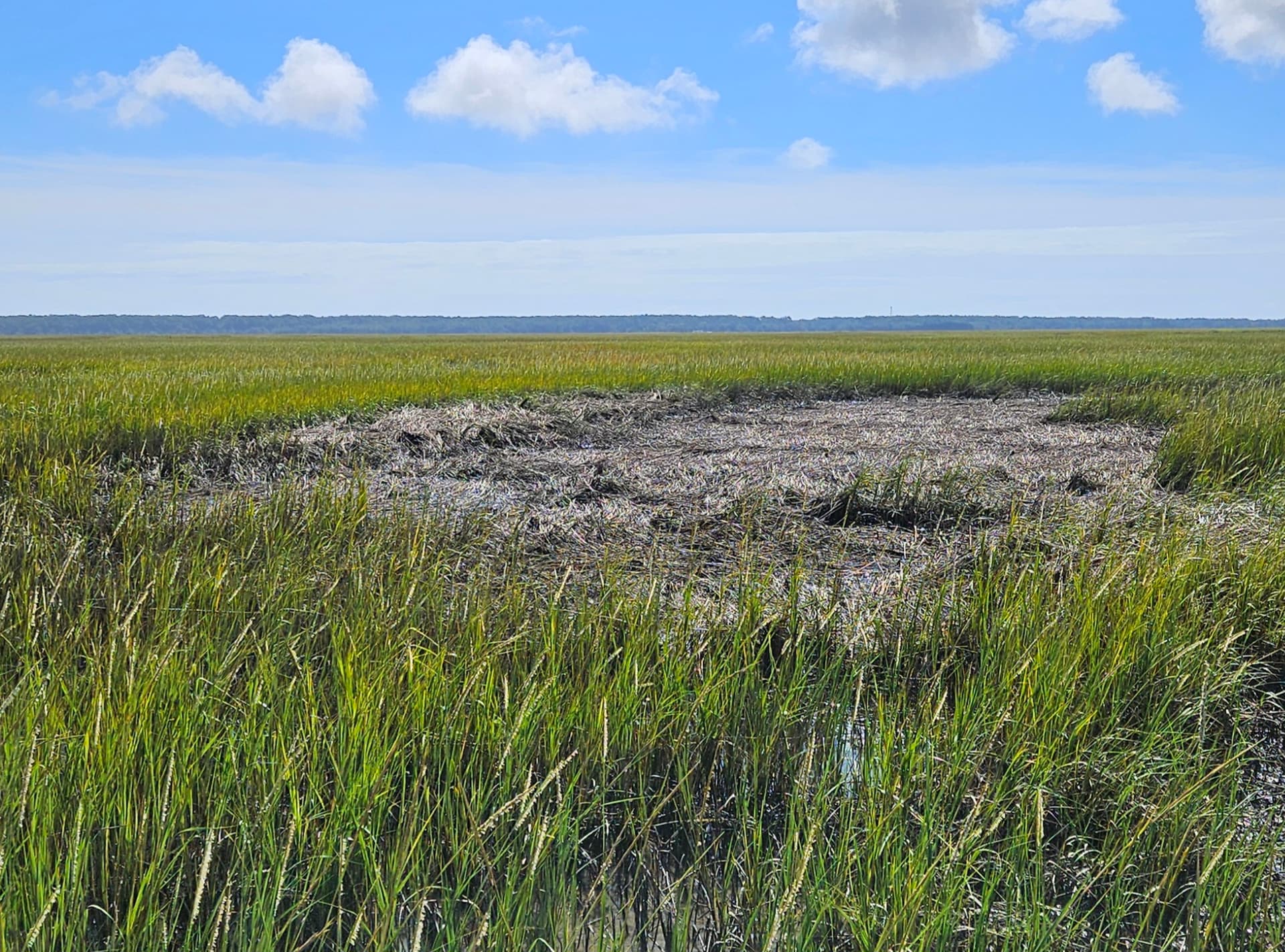 Seems most commonly formed in spring when the new grass is not very tall and lots of old grass around. Once the grass around the spot grows above even a really high tide again, hard for the pile of dead grass to get moved by the next high-water event. No idea what that kind of “dead spot” in the marsh is called.