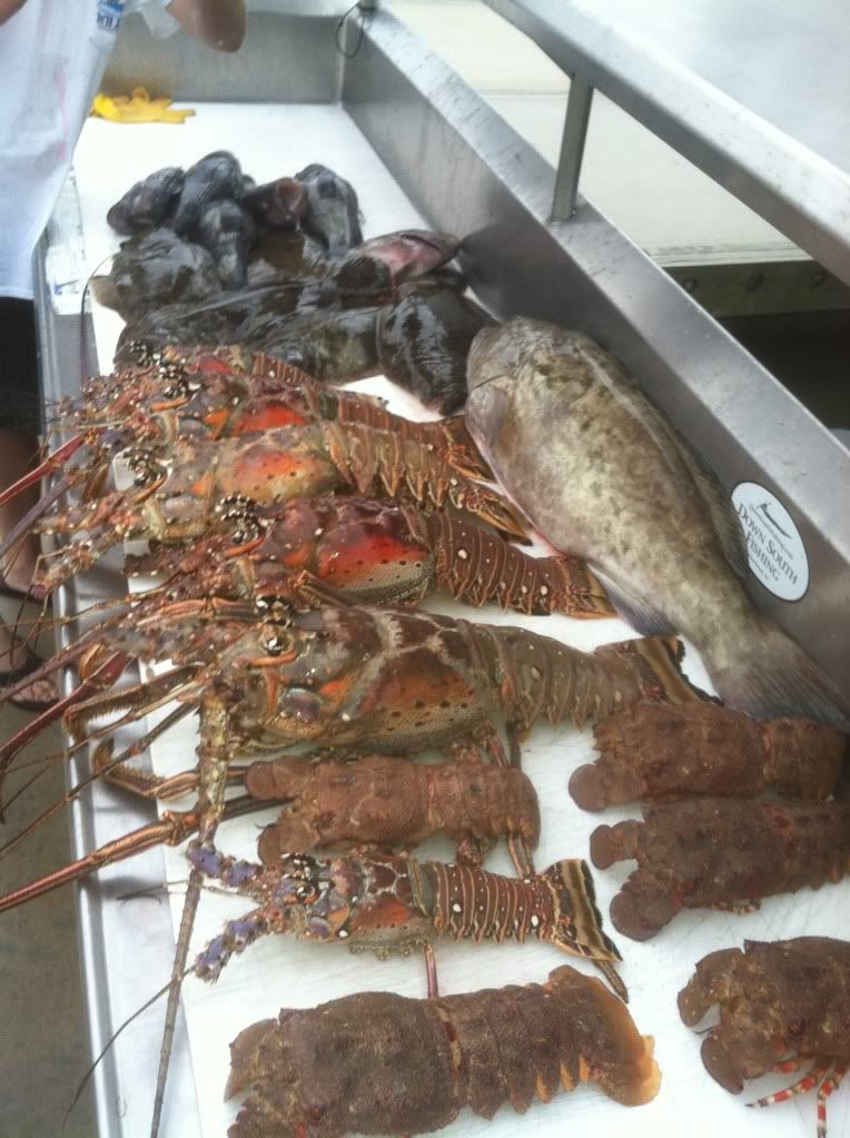 Great day on the water aboard the High Yield. Dropped on a live bottom that was covered with 25lb red snapper! No wonder, Big Bugs everywhere. They were so thick when Scott looked under that rock they started kicking each other out fleeing in fear. One landed in Eric’s lap while he was stuffing the bag with another. Nothing quite like a 8lb bug climbing up your crotch while you are distracted. Watched Scott chase a fleeing Bug across the sandy bottom,amazing how fast a 10lb lobster can move with that large unit hot on the trail. At the end of our dive the bottom was covered with legs an antennas and large Cubera Snapper moved in to feed on the carnage. We were winded as the current was ripping and had to let them live for another day!(Eric shot a 21lb Gag when I had my back turned)Ended the day with some flounders and Bsb’s big enough to shoot!