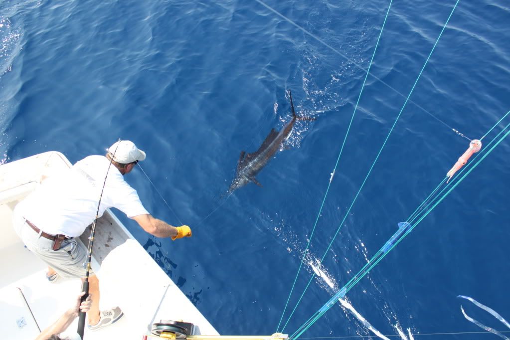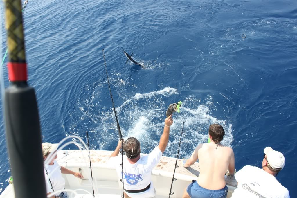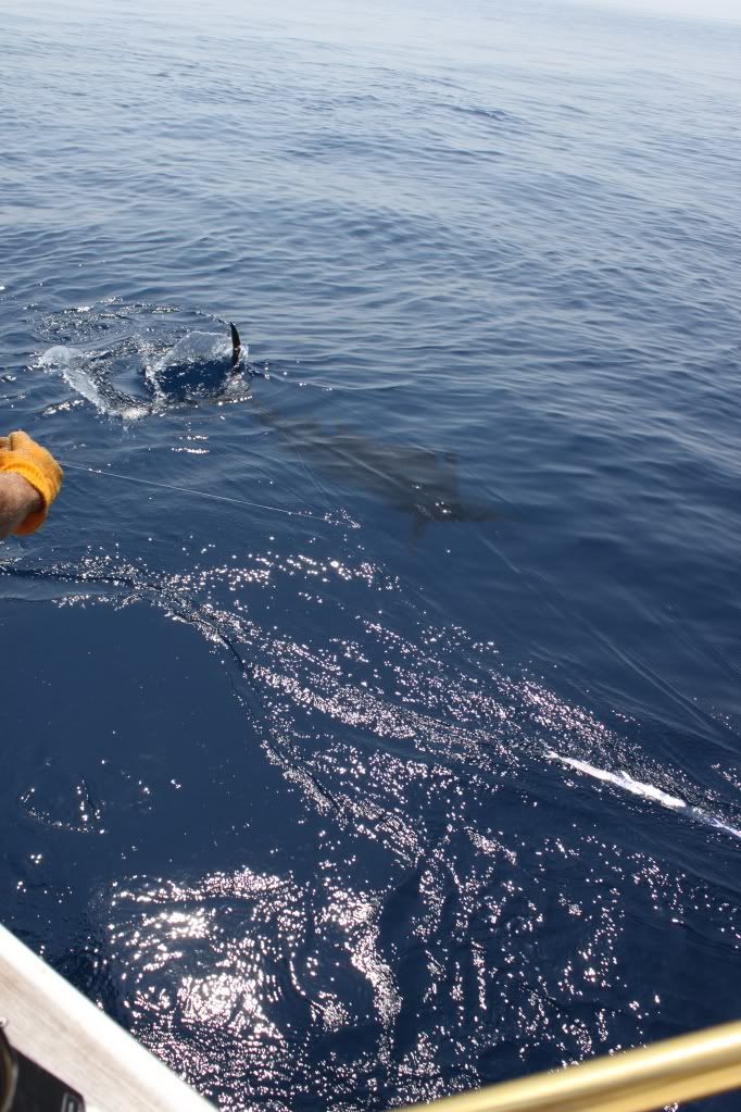 Fished with the Fin Allie crew today. Started at the little dump, worked our way south throughout the day. Went from zeros to heros at 9:30 boating a quadruple header + a pitch. slow fishing picking at dolphin with some finicky shoppers. Released one looking for tags, tagged another when better prepared. Ended the day going 2 for 3 on sails, releasing a double header. Final tally 12 dolphin, 1 wahoo, 2 sails, and 4 jillion pounds of salad. Slow fishing on a flat calm ocean. Glad to be back fishing the circle hook rigs.