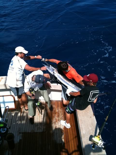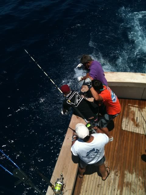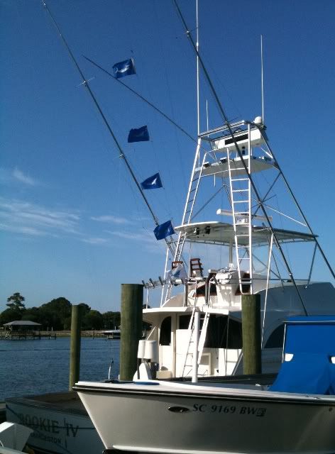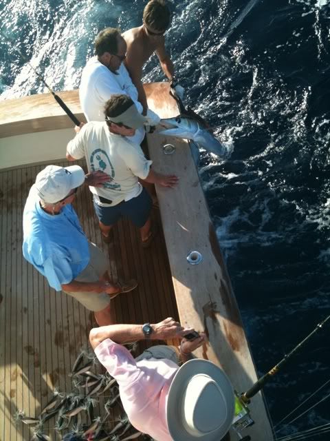 Great day on the water as a guest on the Rookie IV. Released two white marlin and a gaffer dolphin before 9AM. Steady through the day. Able to consistently raise the Billfish with sacrficial “beer shotguns” techniques. Very effective strategy. End result, 4 white marlin released, 1 beautiful sailfish, kept about 10 dolphin (released about 5). Had a wahoo cut off, missed a white, and missed an unidentified billfish (maybe our missing blue Marlin??.