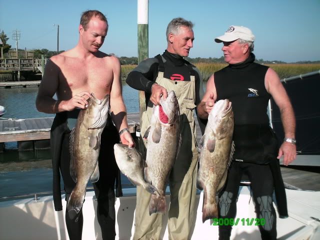 weather was iffy when we got to shem creek this am, we were already there so thought we would try it anyhow. ride out was good with a NW wind, but got a little wet at 10 mi. got out to 70’ and did a bottom drop.vis about 15’ and the gags were all over the place! missed ques, broken shafts and piss poor shooting and grouper that got smart quick, ending the dive with a few goog keepers. did our surface interval there as we left a 30lb.gag on the bottom with 2 holes and a tip in him. fishing was slow but managed to boat a few more grouper, triggers and red porgys. second dive the viz was alittle less but the temp was perfect, ended up with 6 gags and some other bottom dwellers, ride in at 30 as the seas had laid down.great day on the water with auggie dog, james c,and under contract.