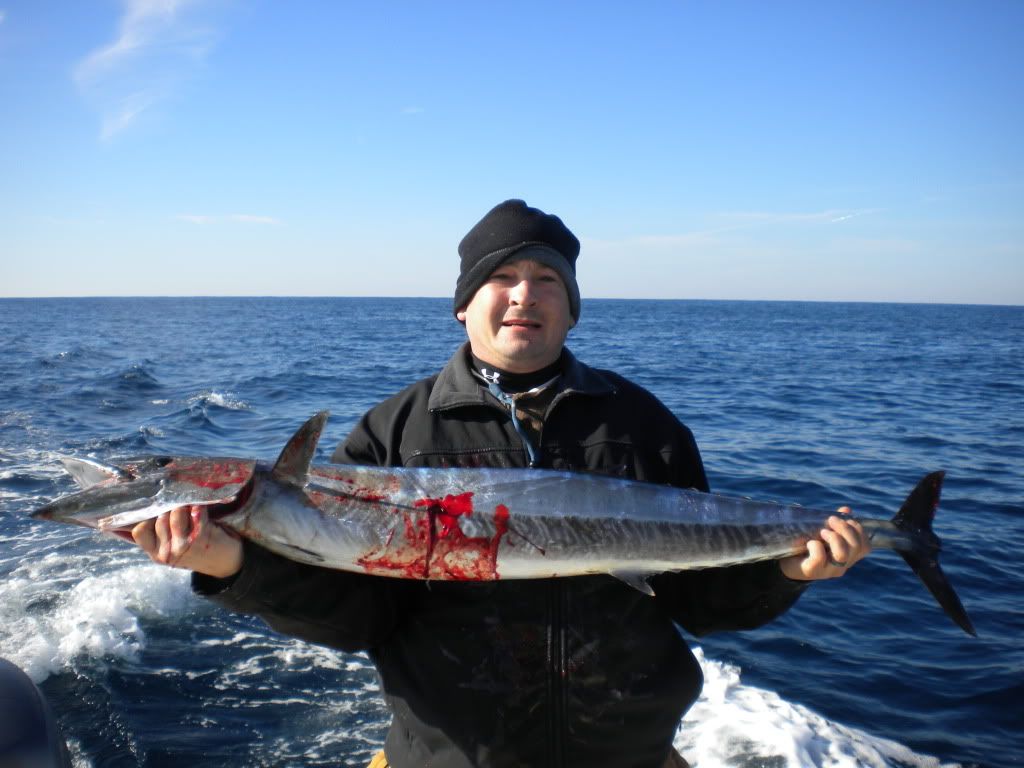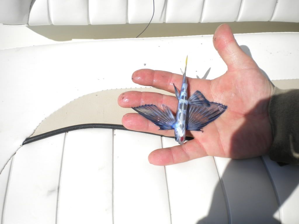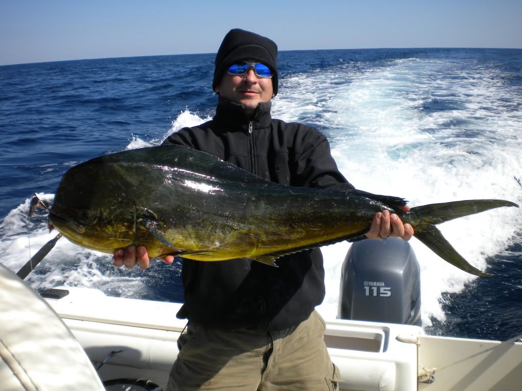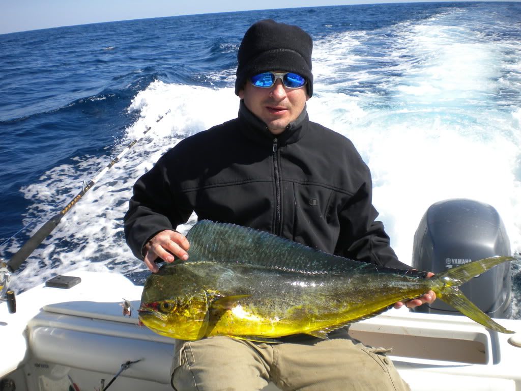 the wife and i fished 69-70 degree break twenty miles from the 30 fathom curve. started the day with a flyer hitching a ride, saw hundreds of tiny mahi in the scattered grass on the break. caught one just under 9#. Wahoo was three weeks ago in 72 degree water. water is the coldest i have seen in a while, 54 on the curve. last trip til april:question: