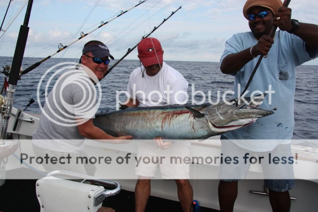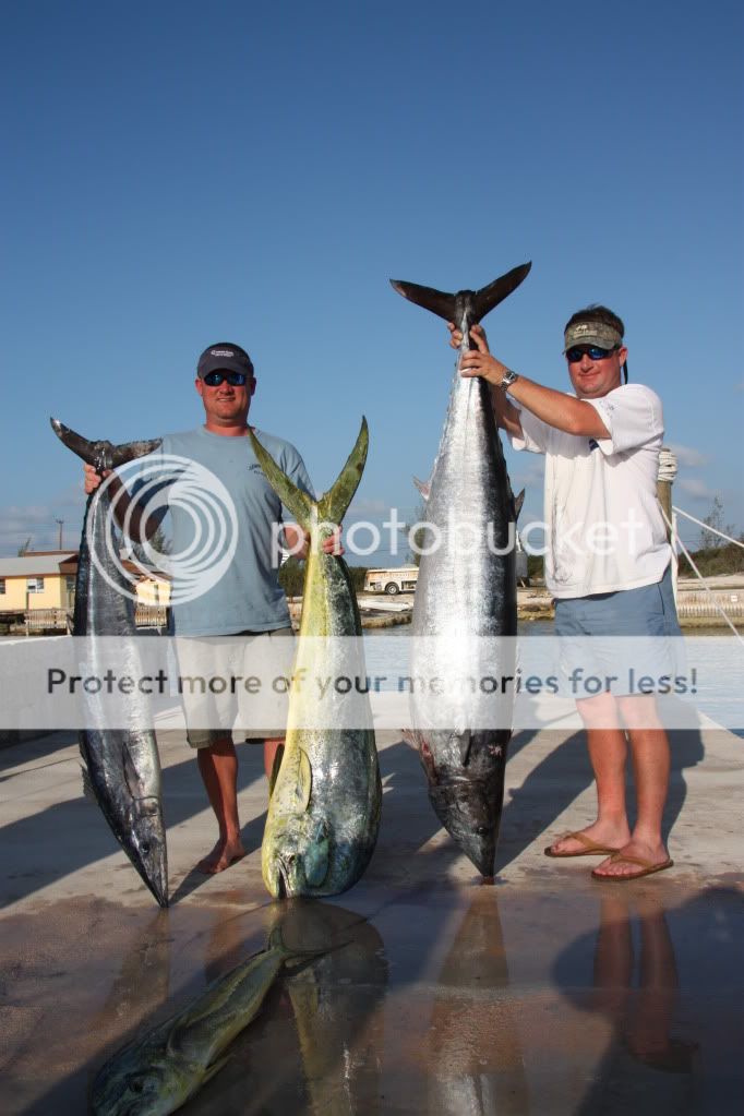 Made it back from the Bahamas a couple of weeks ago and thought I would post a few pics of our trip. I woudl suggest San Sal to anyone heading to the Bahamas. The only draw back is the 2 day trip to get there due to connections on the planes not matching up. The locals were the best people of any island I have been to. The fishing is pretty good too. We were there for two months and had some decent fishing in between the back to back cold fronts that kept hitting us. There were plenty of big wahoo, a few dolphin, lots of small tuna, some big tunas, a whitey or two, sails, and blue marlin. It was good mixed bag fishing trip. We caught 4 sails for the trip, saw 3 whites we didnt get and had one blue marlin and shark chase a tuna to the boat. The shark won and got the tuna about 10 feet behind the boat. Was cool to see the blue and shark hot on the tuna that close to the boat. Biggest fosh of the trip were a tuna about 85lbs, wahoo@ 120lbs, and a dolphin in the 45lb range. The wahoo was a stud biggest Ive caught. We caught about 6 in the 70-90 range. I only had a 60 lb boga grip so all my weights came from fileted fish. The big wahoo had 40lb filets and the rack weighed 40lbs as well. When the weather was too bad to fish we played Dominos with the locals. That was a sight to see! It was a good trip. Glad to be home and ready to run some charters. Oh yeah how bout that one picture with that bird in it. Never saw that thing flying around!