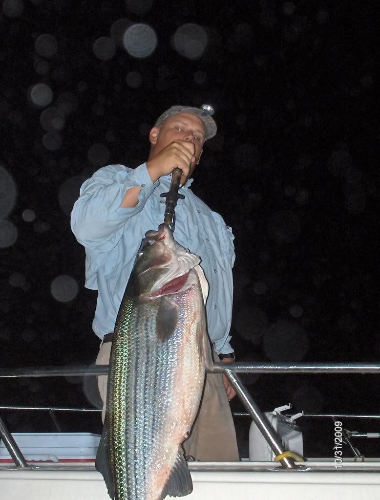 I caught all my fish on the red/white MirrOlure running only about 10’ down. The fish that I caught the night before was great, but I caught my biggest striper last night. It is roughly 37"-38" long. Boy was I glad when I got him in the boat after a great fight. It behaved very well and went right into the net. I may have let out a yell or two. I know that there are much bigger striper, but this one is an awesome fish to me.