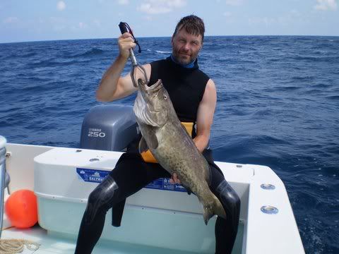 got a call from yellow fever (31 contender) to go and shoot some fish sun. loaded up with john, his son and auggie dog and headed out. did two divws in 100’ and the viz was only about 10’ and the current was rippen, close to the new moon tides i think. we shot a few grouper and i lost a 6/8lb lobster i had in my hands. not many big fish on thease ledges for some reason, water temp was 74 on the bottom, 84 at the surface. viz was 80’ untill we hit that thermo in 60’. decided to go shallow and the viz was worse and the current stronger but the fish were there. saw many ars up to 25lbs just looking at us and lots of washtub size triggers. we ended up with 7 groupers, a nice cobia which wrapped me up bad with a spear through his head and a few other bottom fish. a little sporty on the way in as the wind was still out of the north late in the day. nise bags of meat today and ready to go again!