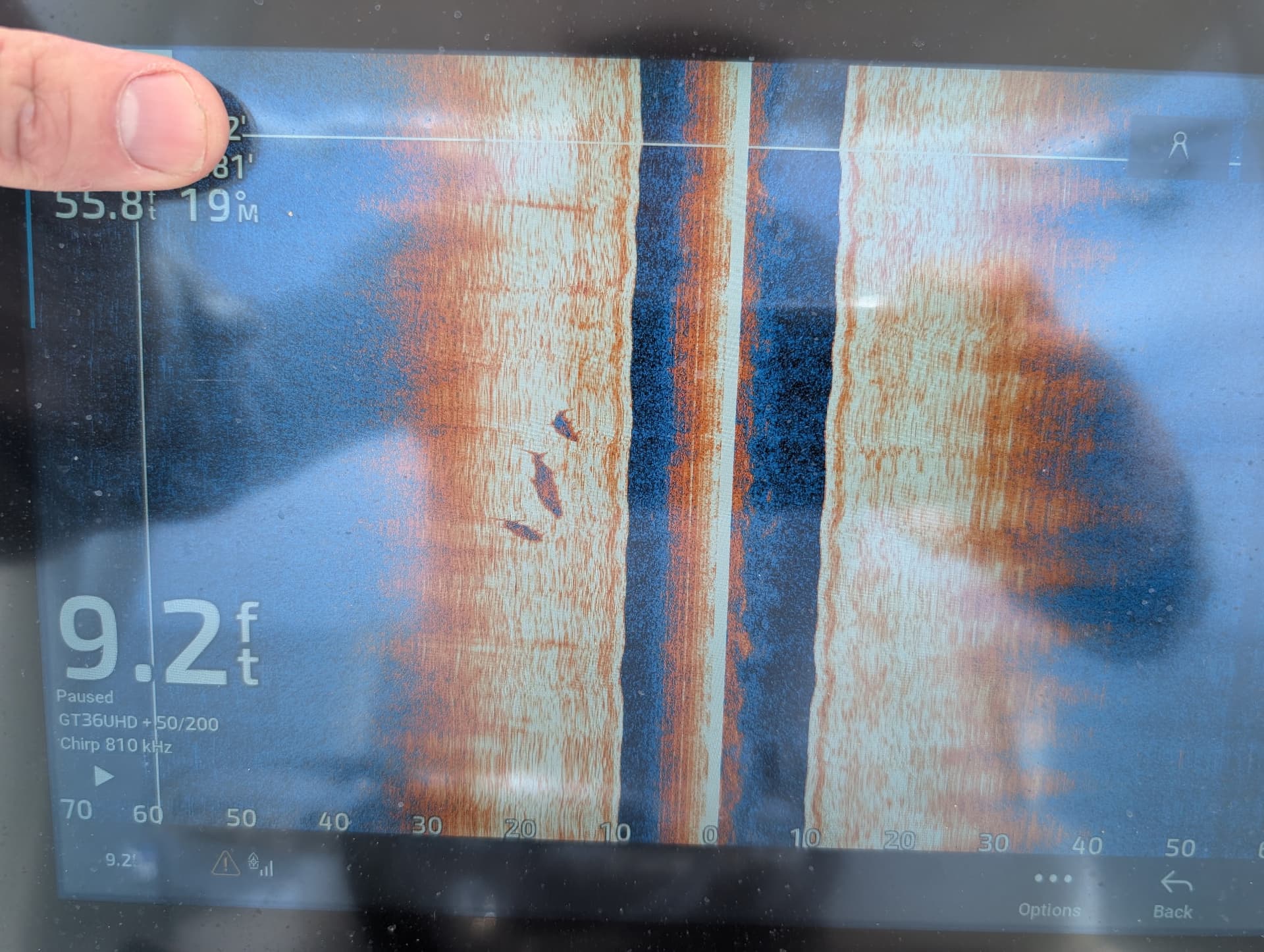 I was able to identify and target the trout on the shallow flat at high tide using my scope. See picture. The small school of trout can be seen at the top of the screen near the upper left corner next to the 6.7ft. The trout were moving but at a much slower pace.