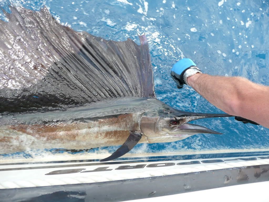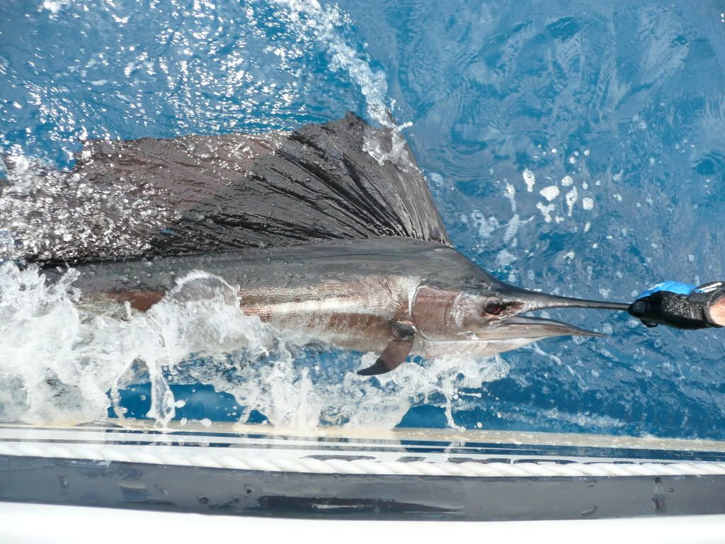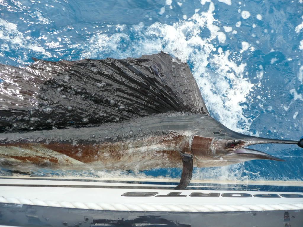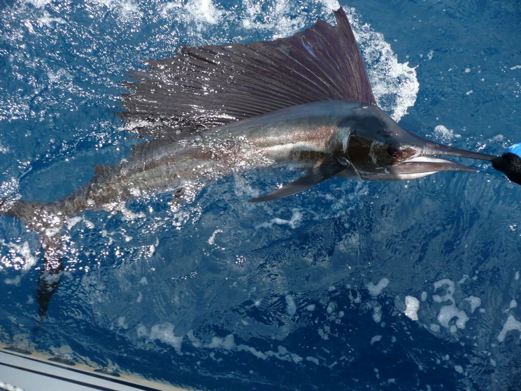 Started the day early with the crew at the marina, then a mishap cost us some time. We cleared the jetties at 0730 and was met with a bit of a sloppy ride, had lines in at 1005. Three gaffer bulls in the boat by 1045. Pushed out a little deeper when it slowed down. Found some more phis as we crossed the inside of the ledge with a nice temp break, found by others as well… We landed a good size sail today (pictures and a short video coming). Left him in the water for his photo opp…
