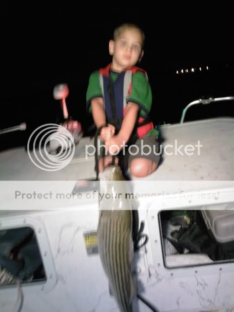 After getting blown away trying to drift the last couple of times out it was nice to find a calm lake. Put in about 7PM with my youngest grandson and drifted a while marking some fish that wouldn’t bite. They turned on at about 8:45 and we got 6 in the next 45 min before we had to leave. Only one keeper, but it was a 27" “big monster striper” that he helped reel in. Great evening on the lake.
