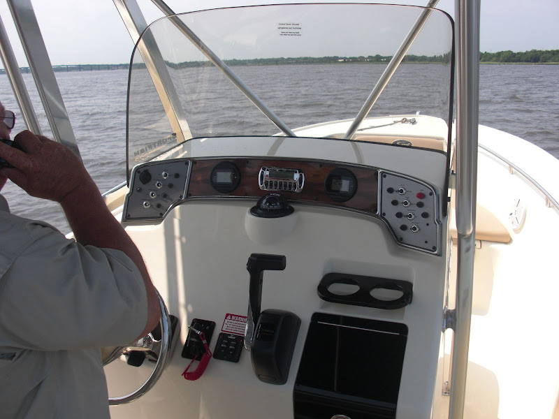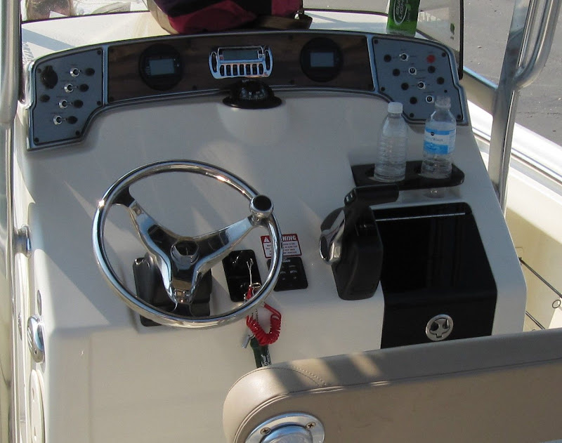 Yeah Hairball, the console layout is the only thing I don’t like about the boat so far. I’m not sure what they were thinking. I’ve printed a bunch of GPS/Chartplotter templates and tried to arrainge them on this console and nothing really works well. Removing that compass mount will allow me to mount the electronics higher, moving them away from the wheel when tilted up. When the wheel is tilted down, I have a clear view of the entire console. Not only that but the switches are mounted backwards in many cases. For example the fresh/raw water hose comes out the port side of the console but the on/off switch for the pump is on the starboard side. The horn switch (red button above) is on the starboard side but the boat is operated from the port side. Same with the livewell, it’s on the port side, but the pump switches are on the starboard side. Not huge issues but I wish they would’ve thought a little more about all of this. I also wish they would’ve gone with more of a sailfish layout of the console, where you have that large blank area up top for electronics and the engine monitors down on the bottom. Other than that, I LOVE the boat and it’s perfect for my needs.