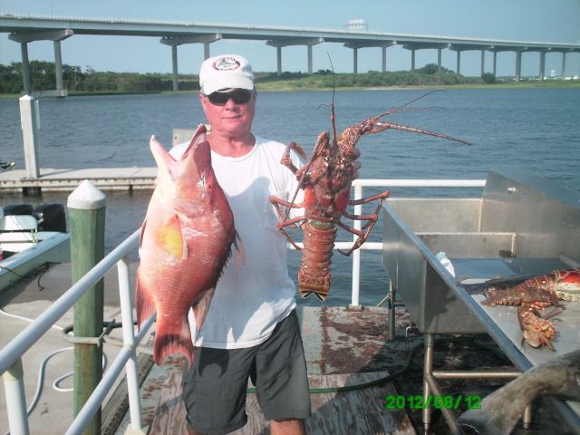 weather looked ify at 5am but the report was supposed to get better and better, 6am at Folly had it blowing @ 6kts. rolled out on confused seas running into the sea but it payed off. weather turned out fantastic, by 10:30 it was flat calm. didn’ fish much and hit the bottom for some meat. first dive produced a few nice bugs and a few good hogfish.