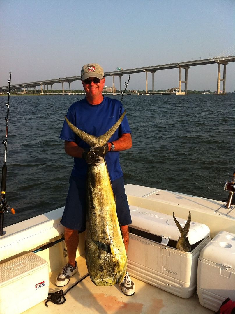 We met up at Rimleys point Friday evening to lunch the Parker 2520. The offshore office guys showed up and of course we had to talk fishing a bit.Those guys gave us the recent fishing info. They were the nicest guys. We launched got rigged then settle in for the night on the boat. Beautiful night in the harbor. We left out around 5:00 AM Saturday morning and headed out to 120 feet, dropped the lines in and had to fish in the boat in 20 min or so. A nice dolphin and a 20 lb litte Tunney . We headed on out to about 400 feet of water and picked up another dolphin about 25 lbs or so. Things slowed down a bit until mr big showed up then I saw a big blue flash in the water the pink skirt got smashed and the 6/0 penn started screaming. Captain Steve played the big dolphin like a pro and after 20 or mins or so had him in galfing range. He came along side the boat and I sunk the galf with both hands into the fish. He immediately tried to pull me overboard . Got my grip and hosted him over and onto the deck. Captain said job well done. We finished the day with 3 nice dolphin a little tuney and Mr big. We tried weighing the bull but he maxed out my hand scale at 50 lbs