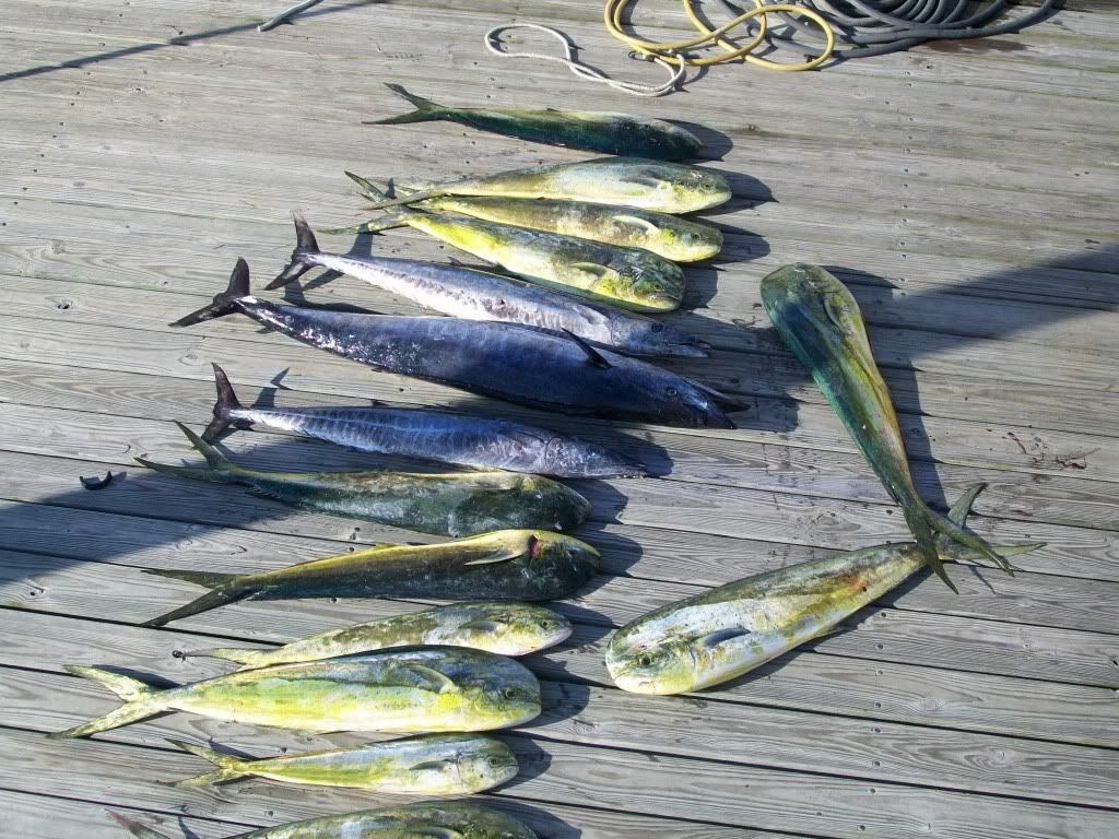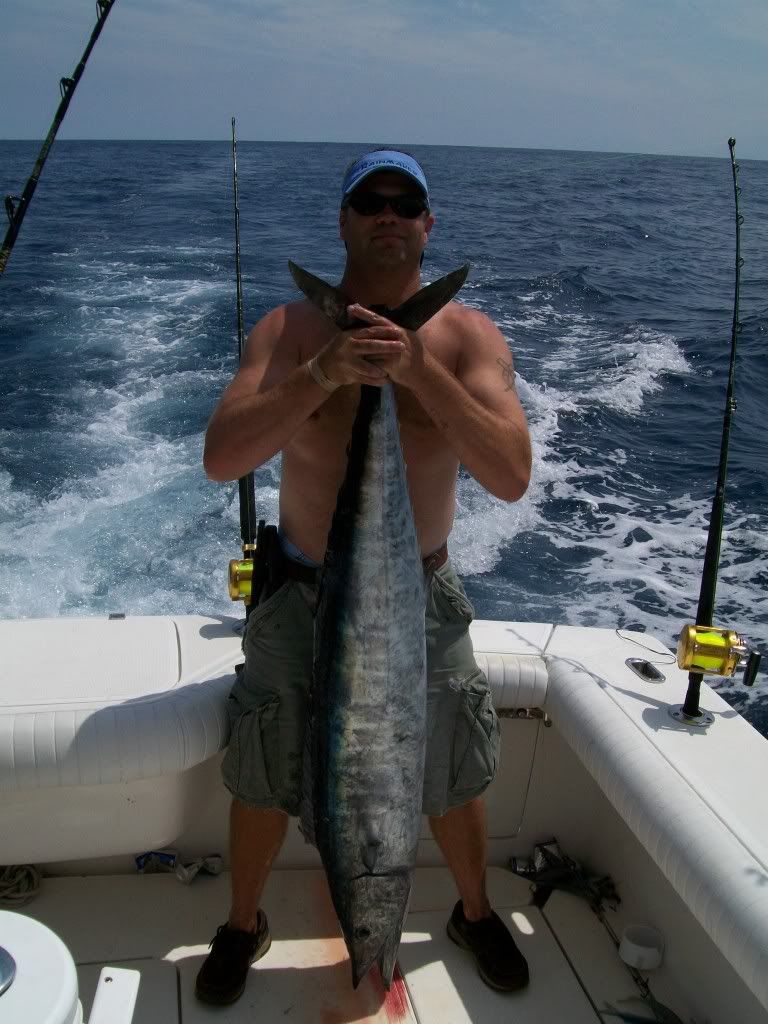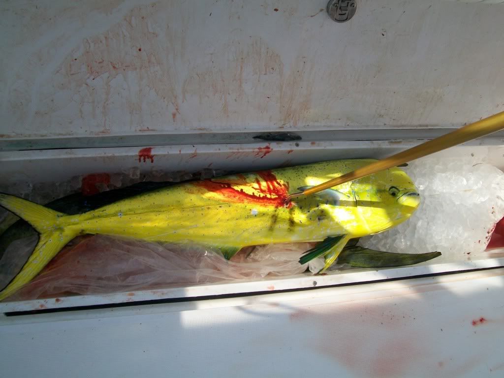 Fished the Scarp area. left Marlin Quay at 0600. Decent swell arond 4-5’ that layed down as the day went along. Found a fantastic temp break at 120’, 3 degrees diff in a boat length, wood/weed/balloons(lots) stacked up. We’d planned on running to 100 fathoms but i put out 3 baits to test…we boated 9 dolphins in short time. Left fish to find other/bigger fish. Hit the break and boxed a few more dolphin and 3 hoo’s. Including my personal best wahoo…I aint gonna lie, i thought it was bigger, but the scales proved me way wrong by 15#'s…anyways, i drug at least 15 color combos and every single bait dragged got hit at least once…Yo-zuri bonitas and blue/pink squitches seemed to get a few more looks than the others. My Hoo came off a tuna rig, with 60# flouro leader, got lucky.