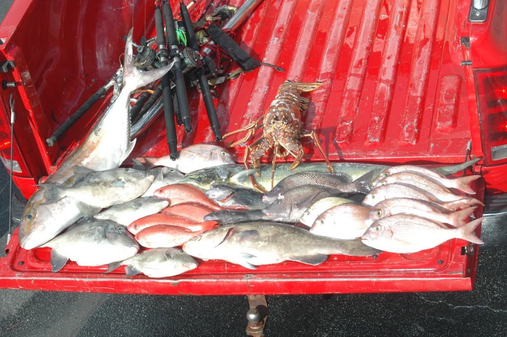 Left out of Charleston around 7am. We were met with 2 rain storms but no wind, so we headed out to our honey hole. We anchor in 111 ft and had dolphin behind the boat as soon as we stopped. Tommy was bottom fishing and we notice a mahi jumping behind the boat with a bank sinker hanging from his mouth. The first fish in the boat was a 15lb mahi caught on a bottom rig with squid. We dove down to the bottom to find loads of large grouper and snapper. Vis was at least 50ft 76 degrees on top 72 on the bottom with a cool thermocline around 35ft. Daniel and I shot snapper and grouper and he picked up his first bug and I did also -between 8-10lbs. Tommy caught triggers, snapper, bsb, 30lb amber jack, porgies and a mahi. It turned out to be a great day on the ocean.