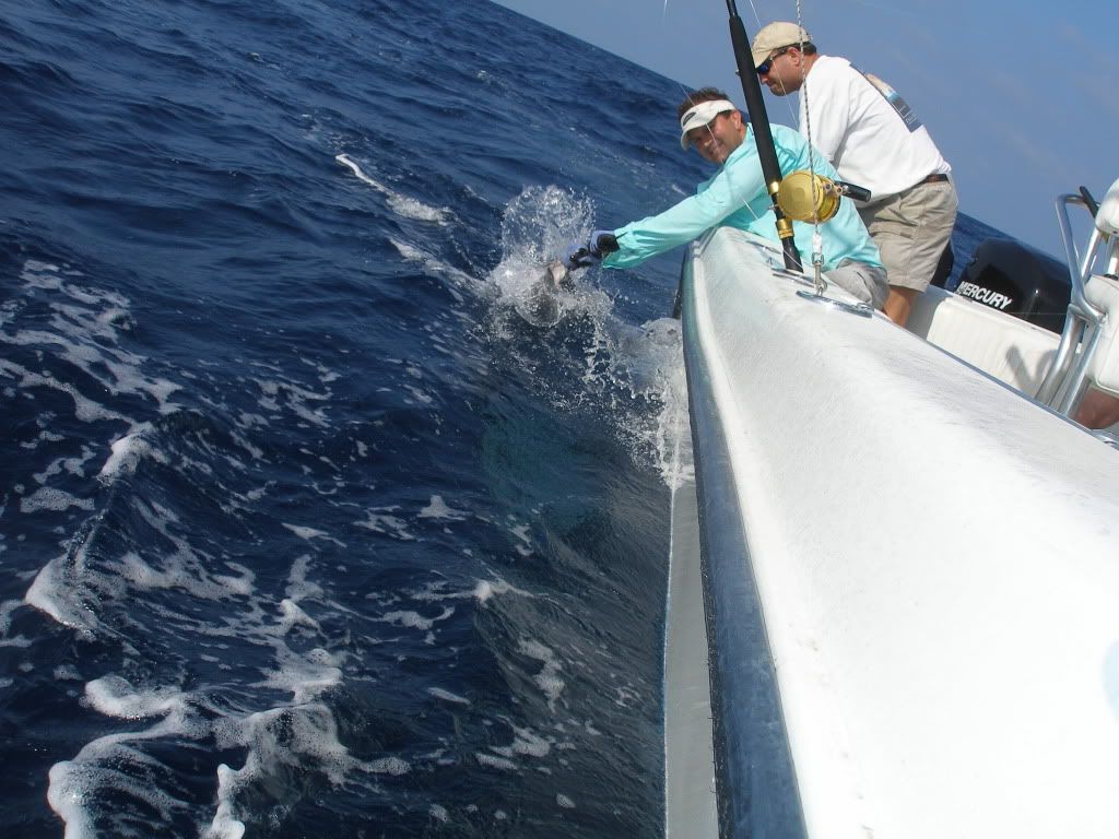 Well, even though it was bumpy we still had fun on Sunday. After seeing all the reports (along with pics) of the mahi being slayed, Dave & I figured it was gonna be a big day for us. Pulled away from the Cut at 3:30 am with the crew being me, Dave, Jeannie & Jeff. Got outside the jetties and was met by a 2-3 ft churning slop with a stiff headwind. A couple of waves over the bow, and the crew began whinin’ about pulling out the curtains. The captain being one tough hombre (and nice and comfy behind the glass) wasn’t complaining one bit, but no one wants a cryin’ crew so out came the wings. Jeannie & Dave settled in the EZR’s for the ride out, Jeff & I manned the helm, kept an eye on the radar & blindly ran thru the slop at 30-31 kts. Started fishing around 5:45 am & had a small peanut to the boat within a few minutes that we threw back. Then nothing. Around 10:00 am the winds shifted & the seas began to build–so we kept a close eye on things–it was going to be a nasty ride in. We saw a ton of flyers, but no weeds & was the slowest offshore day that we’ve ever had–only 1 mahi over the next 3-4 hours. Finally, we had a sail come in and hit the short outrigger, let go, and then hit the WWB. Fish on. Dave grabbed the rod worked him to the boat, I billed him, Mid Level photographer Jeannie Swain took a couple of pics & fish released unharmed. A day saver. Caught one more mahi to end the day. Pulled in the lines around 2’ish & braced for the nasty ride in–waves not all that big–just steep–only could make 21-24kts. The most impressive performance of the day was by Jeff–his wife just had child #4 six weeks ago & he came–my new idol.