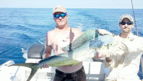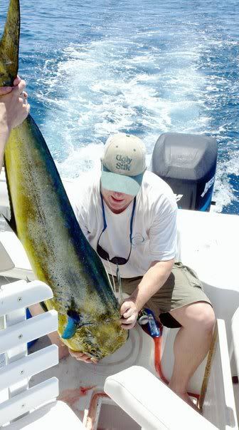 We had some great fishing during the week. Ed. John, Pete, Jordan, Robert and Ken. Mainly caught fish in the 175 to 300ft range. We caught some really big Mahi. Saw several marlin and a migration of rays that turned the water green. There seemed to be thousands of rays through the water column.Robert and I tagged teamed a mahi. He hooked up on a large Mahi and faught it for the longest time. I had just made this squid chain lure with 6 red and yellow florecnt squid. The fish came into the boat and went deep. The mahi turned and wrapped the props and broke off. We thought he was gone. However, I looked over and saw my squid chain running through the water. I told the guys to hand me my speargun and I got on the bow of the boat and we proceeded to chase the mahi and I took about 4 shots and missed. We continue to circle around and on my 5th shot I connected right under his eye-see photo with chain and spear. It was amazing that after 10 minutes the fish never did go down.
