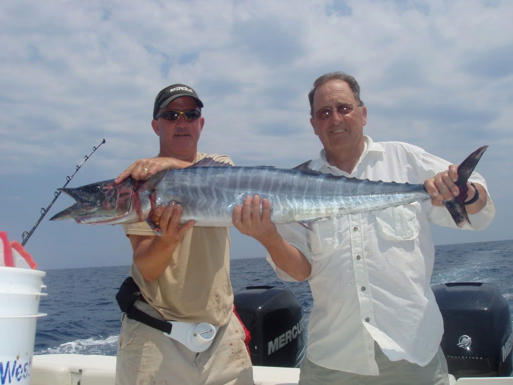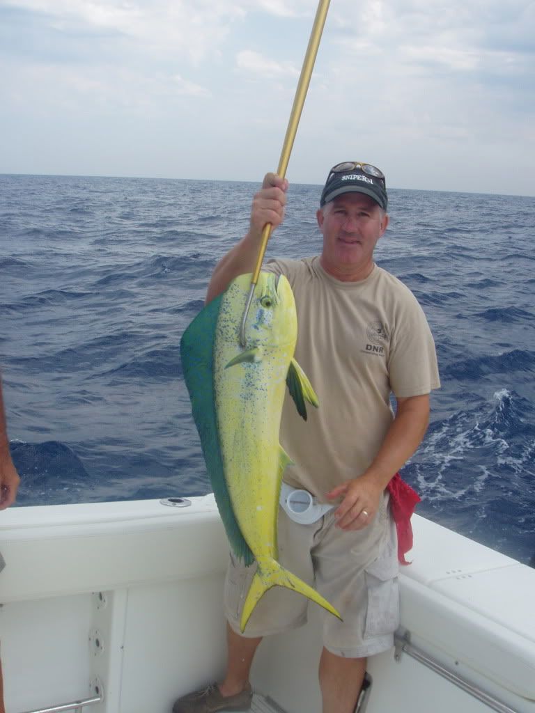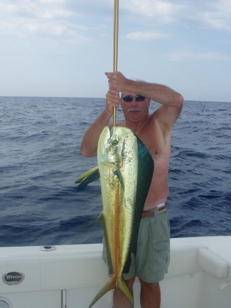 Had my regular crew aboard papas’s toy today .Best friend and first mate Mr. Tommy , Bill & Brad. Left my dock in MI 6 am lines in the water 8 am. It was a much slower day today at the scarp fished in 150’ to 350’ today and the bite was slow. We did manage 5 dolphin biggest 20 lb., 1 wahoo 25 lb 1 king 15 lb. All in all an ok day. Just beat the thunderstorm back. Going again Friday.