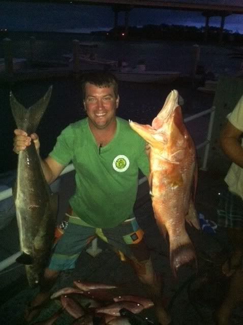left a little late after 250 left me on the side of road at 4:30am. luckily new diver marvin lives in SV and cut back to load all the gear and lobster wraps! headed out to see a big storm on the ledge. held out around the trolley cars utill around 10 and watched the storm move north. we ended up with 6 limits of nice big beeliners, good sized bsb’s, a few triggers and marvin had the hot hand landing a nice 20lb ars and a nice 15lb gag and a couple smaller ones untill erics guest out of greensboro nc who was putting 2 3to4lb linners in the boat at a time landed a nice cobia!rolled south to do some diving and the weather turned out fantastic! viz was only about 15’in 85’ but doable and on his frist dive eric made a diffacult shot on a 20lb hog when the fish swam within 3" off the end of his gun. snagged a few lobsters and released a few bearing eggs. ben did a dive with marvin a nd they produced a few scamps and somemore bugs, a great team effort! second dive produced more dive gear others left behind and another bug, the grouper were no were to be found on that secret #. got a bag of dive weights, nict 6’ pole spear and a snorkel. arrived back at the landing at dark as the big storm hit, piled every thing in the truck fish and all in a downpour.