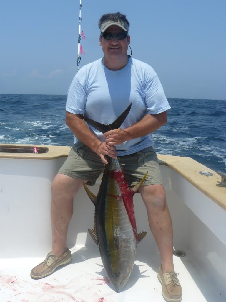 Fished out of Oregon Inlet/PIRATES COVE MARINA thursday aboard the SAMANNA. Started out slow with a small 15ish lb Yft first to come aboard. The chatter on the radio made us feel more was to come with others hooking up closer to the Point. Found the fish and immediately had a triple hookup. Gaffed one of the three and went looking again. Had a couple more bites but didnt come tight on the fish. Had a quad hookup and one of those was decked. Just couldnt keep a hook in um. 4 YFT’s made the ride home up to about 35 lbs. One small slinger Mahi. Hot colors were green and pink. Most bites were on the flat up close to the boat in prop wash. Capt HUCK HARRIS and his mate Brian were a pleasure to fish with. They worked hard all day to find and keep us on the fish. I would definetly recommend them to others. 1st class operation!