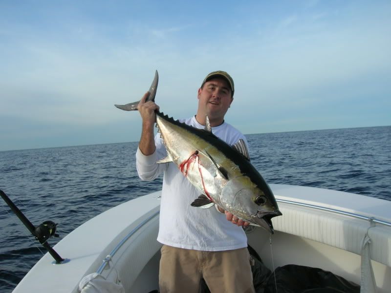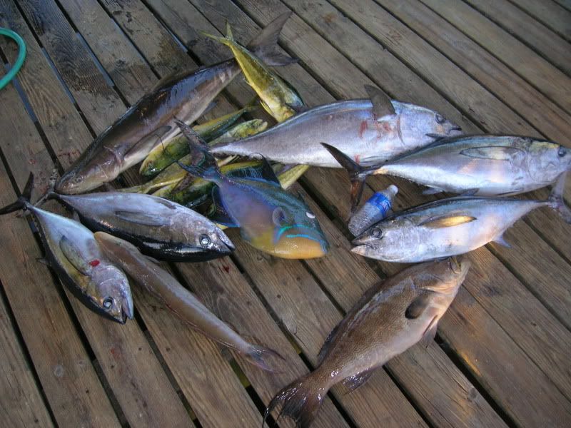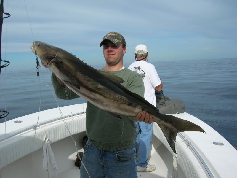Trolled the ledge from 7am to aabout 11 am. Got 5 nice Blackfins biggest was 30# on the scales. Then we pulled up on some bottom in 125’and had 4 big cobia run us down begging for food. Gave one of them a cigar minnow w/ a 20 oz bank sinker! Then some pnuts showed up and we caught 5 on the spinning gear. Got one nice yellow mouth and a big Queen Trigger and what I think is a sand tile. Ocean was great.