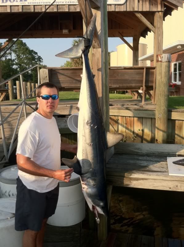 Then a Mako nails a Rapla. We got him boatside and put a gaff in his head and tail. He sat moitionlees for 5 min or so while we cleared the extra fishbox to put him in. We moved the gaff from his rear and stuck it in the other side of his head to pull him in and he EXPLODED. Ripped free from both gaffs and took off. Finally we got him back and tail roped him and put him in the box. We went to ice him down 20 min later and he exploded again. Those things are dangerous.