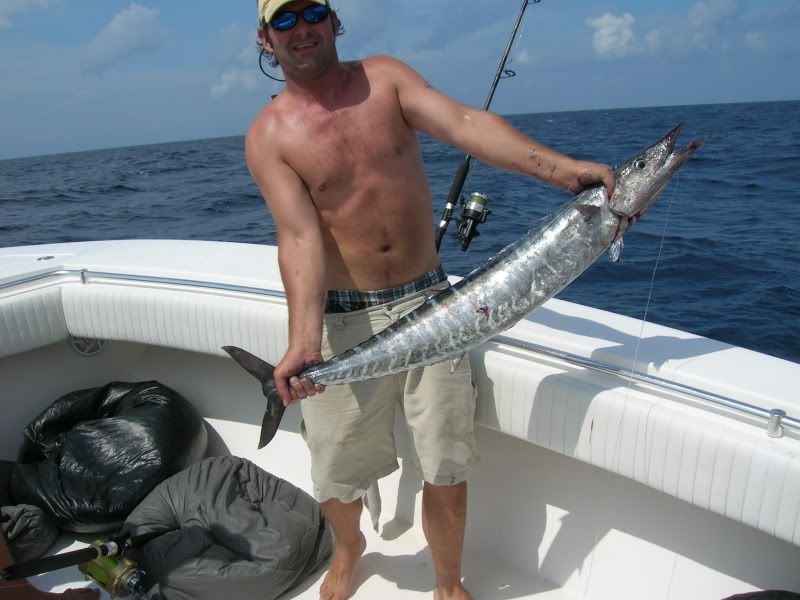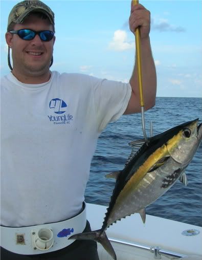 Ran out of the jetties at 0430 to be greeted by rain, wind, and lighting but it was just far enough to the north for us to make it out of the Gtown jetties. Started at the hole and picked up a BFT and jumped off a very large Dolphin. Pushed out deep around 8am. No action for a while so we pulled out 4 PB & J sandwiches. That did it. Fish on! Released a White and jumped another off.
