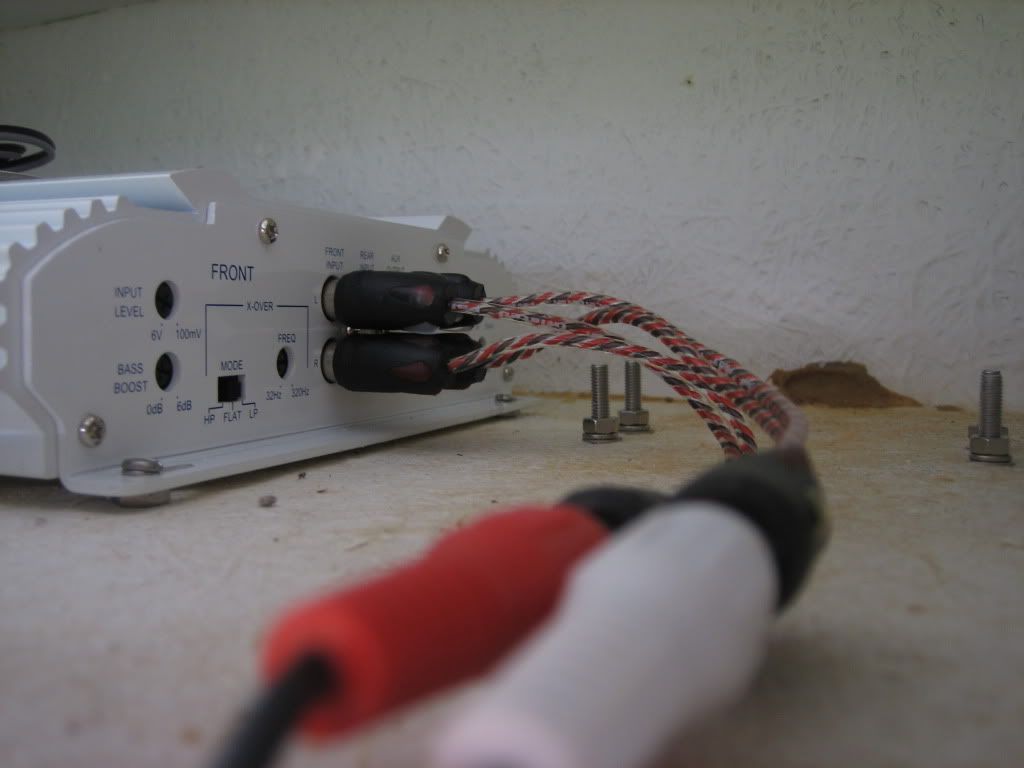 Ok, project is 100% done. I installed the AUX jack today (just drilled the hole and screwed on the backing nut) and bolted down the amp. I also took some pictures although its so simple there’s not much to take pictures of.