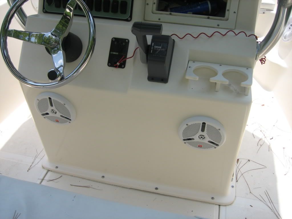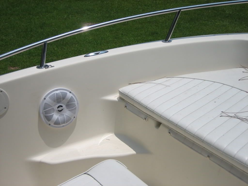 Well, the radio on the boat is about 90% finished. Speakers are in, wires run, everything hooked up, and it sounds great! In fact it worked so well I thought I’d give ya’ll a final report in case someone wants to duplicate what I did. I did everything myself except cutting the holes for the speakers and pulling the wire (which was really a good bit of the work). I couldn’t bring myself to cut holes in the boat so I had the professionals do it. Kevin Cobb of Blue Heron Boat Works did that for me and he did a great job.