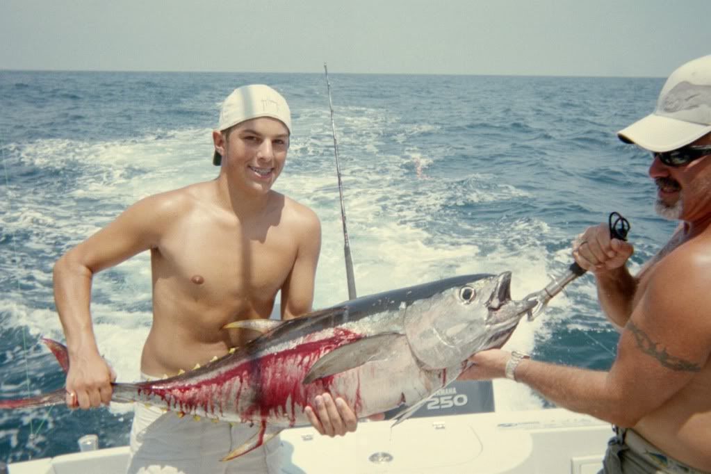 spent my days on the beach with a hand held VHF in my hand listening to the weather all day hoping each report would be different than the one before. Thursday it finally was the 6ftrs and winds were coming down and changing directions at least for a day. The only problem was all the cpts said the tuna were gone of course who would really know as nobody was getting out. Well thursday my plan was to go south and find warm water off hatteras or go all the way to SC to find it. Got beat up hard head on into a tight sea. finally broke 78 deg about 40 miles south and out past the point. but know major temp break and i was already in 1000ft of water. As forcasted the seas started down and i kept going. caught mahi 18lbs and thought the day was gonna be OK, 6hrs later nothing, i was so deep i had lost the bottom on my fish finder. 2500-4000 ft. I had not even seen a single weed in over 50mi. 2pm spotted some big dolphin black ones 14-20ft long. ventured over out of curiosity and the way back starts to sing and take on a seprano tone. Was running a Penn int 70w there and this fish was getting alot of it. My son grabs the pole and i tell him to add a little more drag all the way to the strike stop and nothing (**() we are gonna have to go after this guy so i turn quarter to it and it slows a bit as we clear lines. i was
