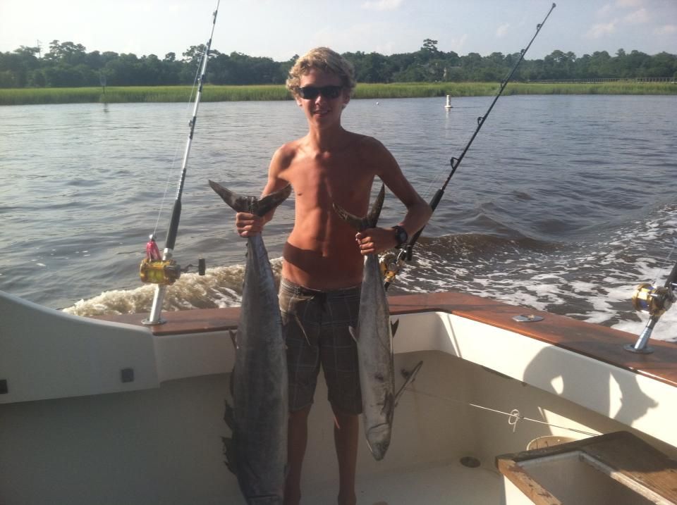 After a few takedowns and one peanut the bite slowed until about 1:00. A nice wahoo tore threw the spread taking down 2 baits before he committed. We got him upside the boat and he spit the hook... happens. Right as I decided to take a quick nap on the fish box the boat blew up with screams and ruckus about a Sail in our baits. Sure enough he took it and ran. After a 30 minute fight he spit the hook under the boat. It would have been my first billfish :imp: We continued to troll and caught a nice king. As we were pulling in rods 2 barracudas hopped on and gave my friend and me a fun fight, We headed back to the Hill around 3:15. Great day in South Carolina.