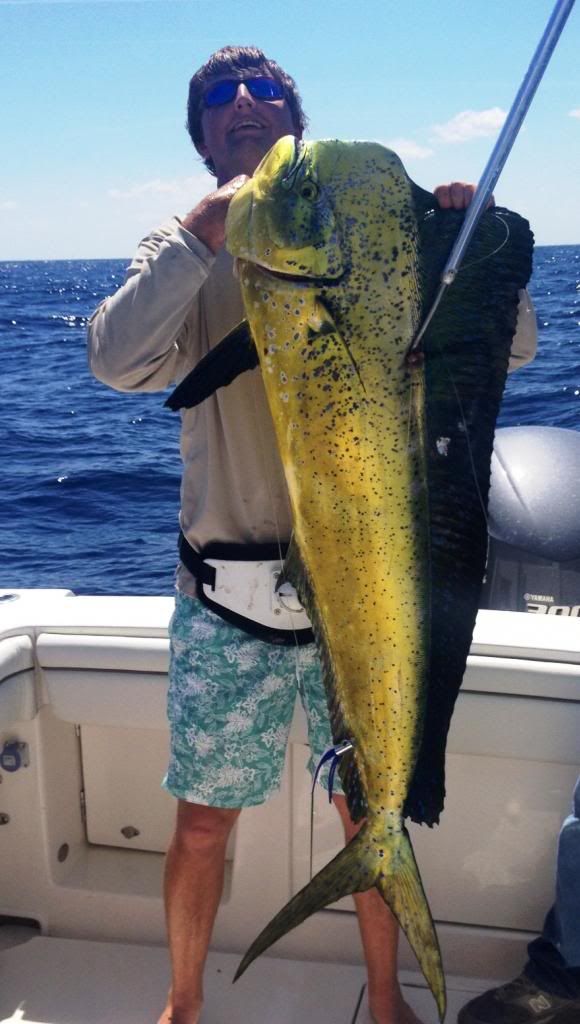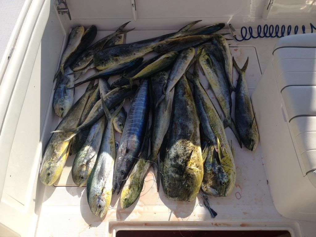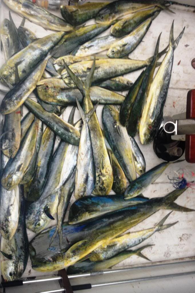 On Saturday, headed slightly south. The water had pushed in a little, and there was a rip with a decent weedline in 220 ft. Caught lots of dolphin trolling and some on the spinning gear (inshore rods–lots of fun on the 4000s). We had a limit of 40 at noon and put on the marlin lures again…just more dolphin which we had to release. Lots of slingers but a good bit of gaffers mixed in and one stud fish.