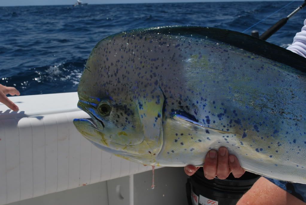 Moved on a little bit deeper and picked up a blackfin on the center rigger and found a small weedline forming. Worked that with a few other boats there and picked up some peanuts, then a decent fish. I was honing my gaff skills, so I went for the tail on this one.