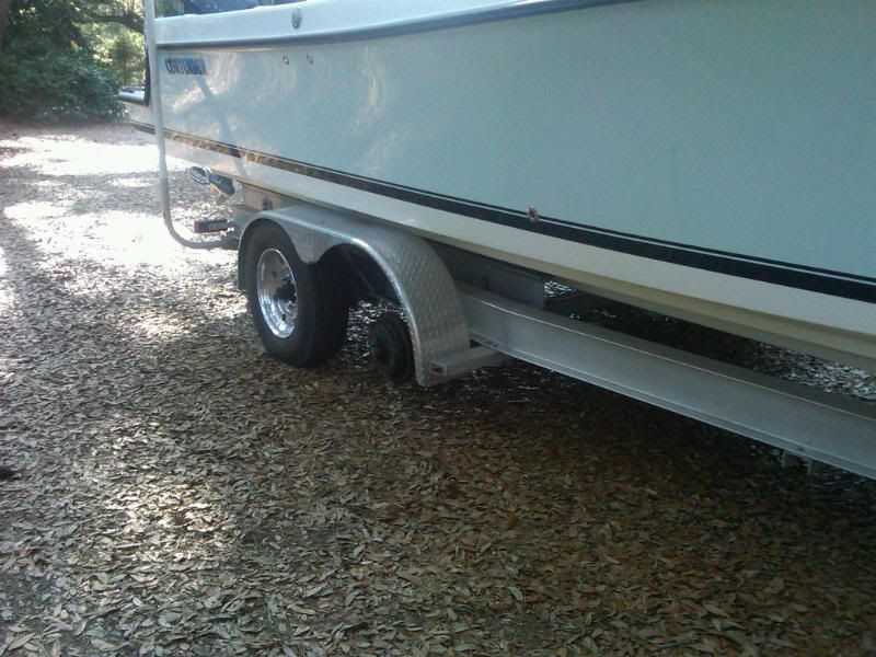 Leave Columbia Saturday around 12:00 for a nice easy trip to Beaufort with my sons with boat in tow. We had scratched fishing Saturday and planned on Sunday. Around Walterboro I look back in the rear view mirror just in time to see the front right trailer tire peel away from the trailer and roll/flip across the fast lane into the woods. Fortunately there were no cars around when this happened and no damage to the boat or trailer. All the lug nuts were sheered off too.