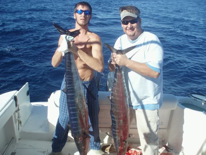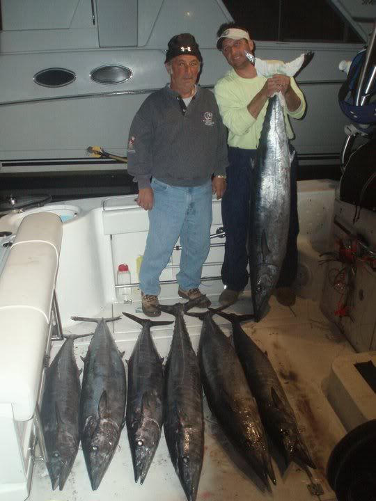 The DIRTY MARTINI crew strikes again. We made it out to the 100/400 yesterday in hopes of finding the Hoos. It started out slow but about about 9:30 that all changed. Went 0-5 to start, had mono BFT rigs out, they seemed to know which ones to target. Quickly changed it up and that made all the differnce. Got on top the numbers and the wolfpack didnt let us down. Immediate triple hookup, decked a couple then another triple, stuck them all. Picked through them till about 2PM putting a couple more in the boat. All in all, 12-15 bites with 7 fish in the boat. Shoulda had twenty. Amazing Day…probably our best ever for wahoo.
