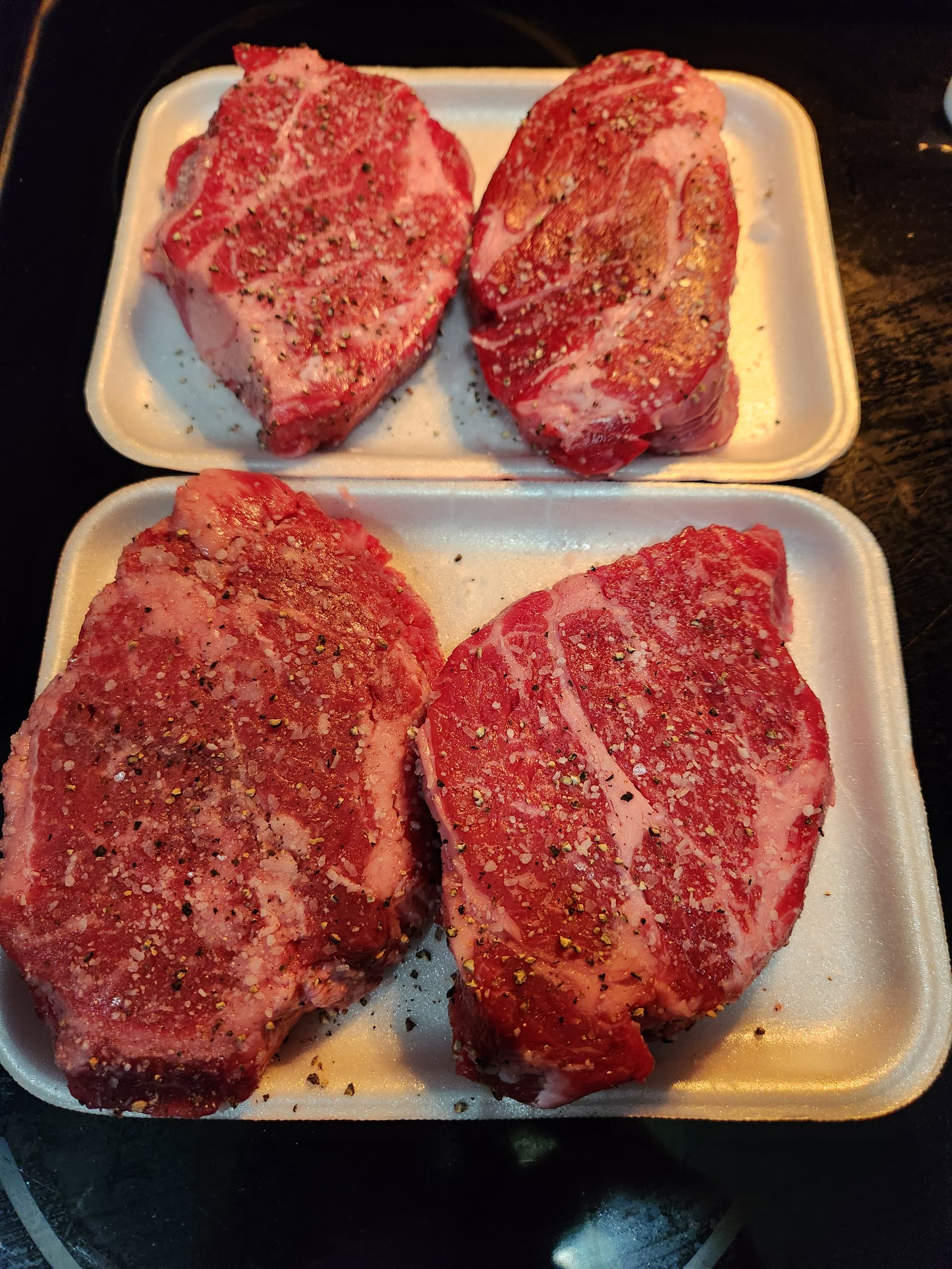 4 Chuckeyes were less than 2 ribeyes. Every bit as good, maybe better. Kosher salt, fresh ground peppercorn medley, Weber…