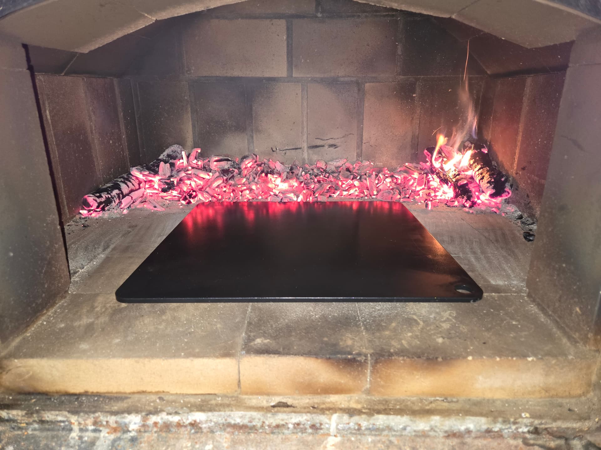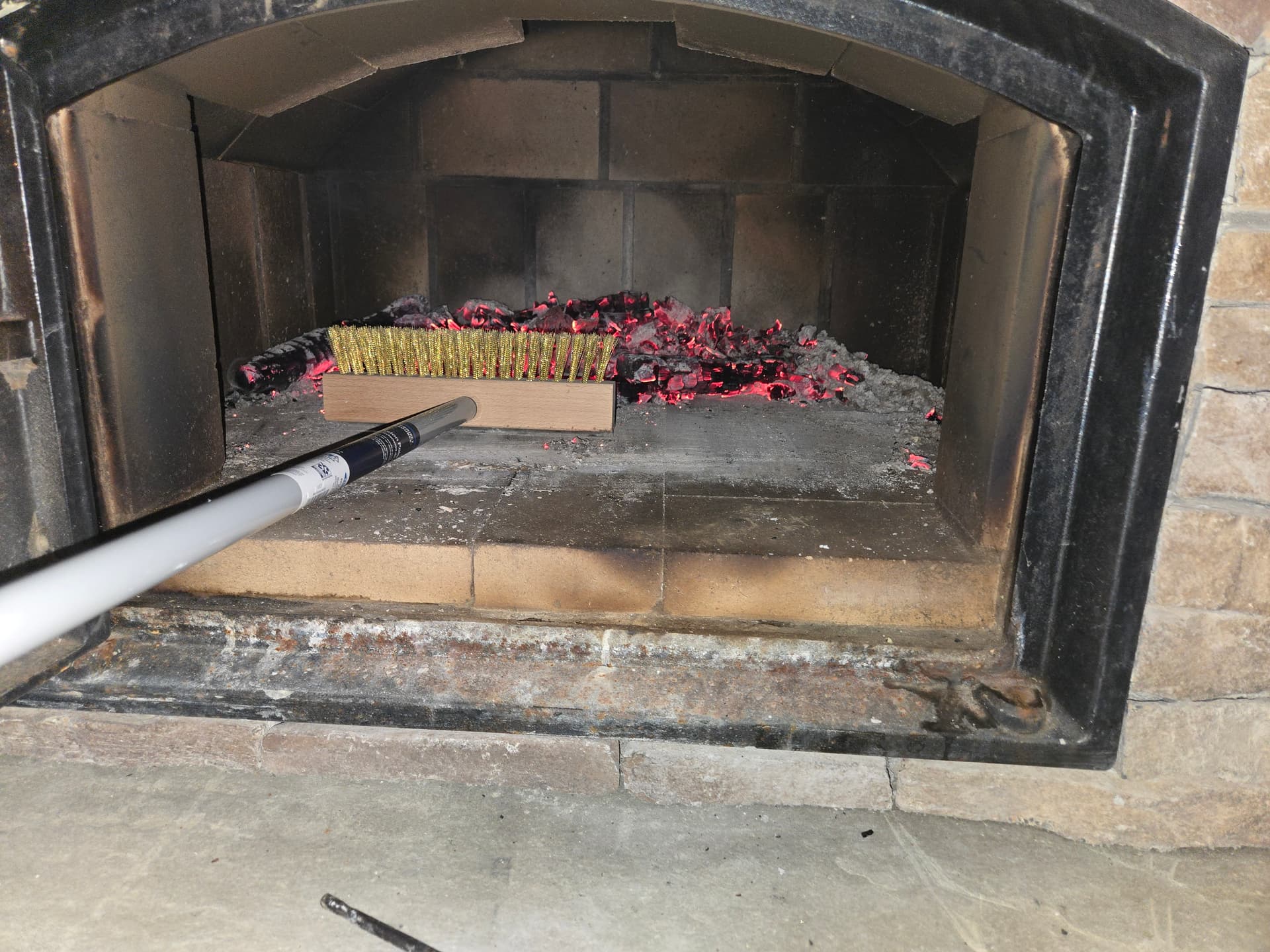 then you rake/push the coals to the back and around the sides and brush with a brass bristle brush before placing the steel plate on the hot firebricks.