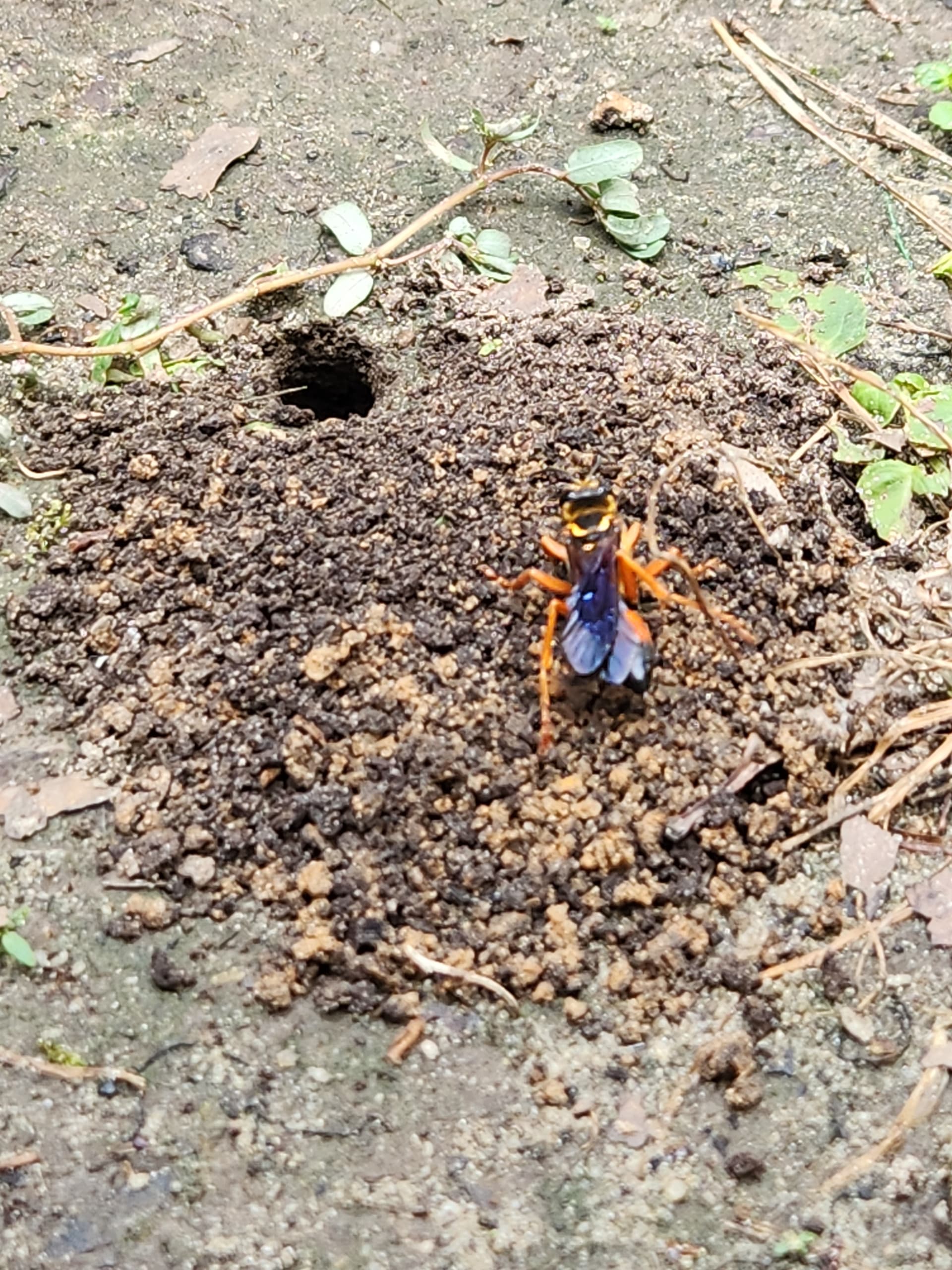 Watching a ground wasp drag a grasshopper down the hole to her larvae.