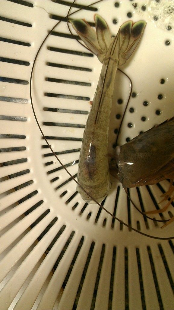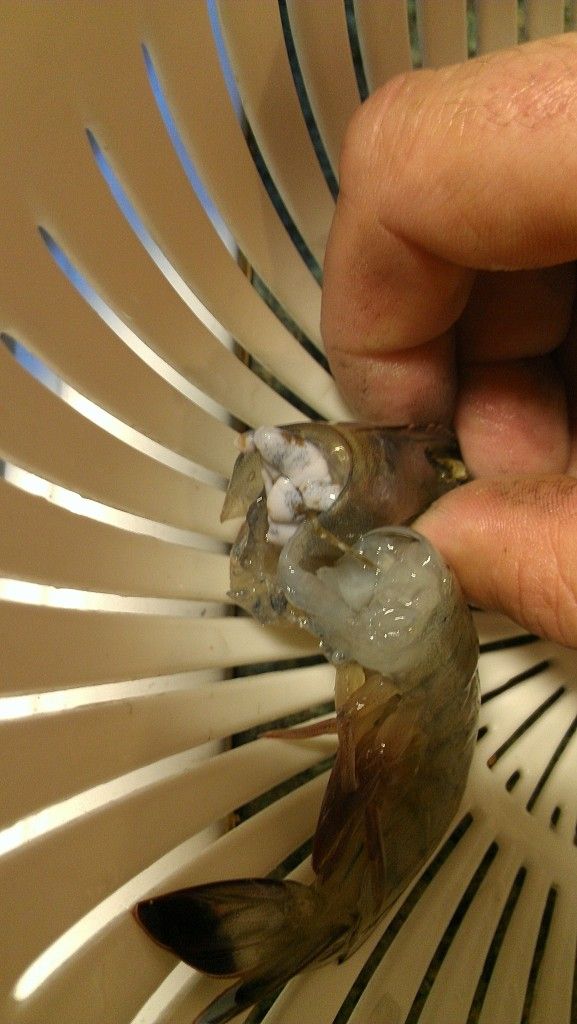 I caught about a 1/4 cooler last night and cleaned them once I got home. I noticed this shrimp looked weird from the outside, I could see something under the shell. When I went to pop the head off, this blueish white mass was inside of it.
